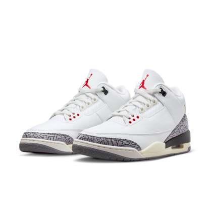 Introducing the Air Jordan 3 Retro 'White Cement Reimagined' - celebrating the 35th anniversary of an AJ3 classic. This reimagined design is true to its original 1988 specs, complete with a white leather upper and elephant print overlays on the heel and toe. Subtle hints of Varsity Red form the signature Jumpman logo and lace loops, plus Nike Air branding is featured on the back heel tab for added flair. Enhanced cushioning comes via a visible air unit for lightweight comfort, while yellowing on the back heel and midsole make for a vintage look. Get ready to join history in these timeless shoes!