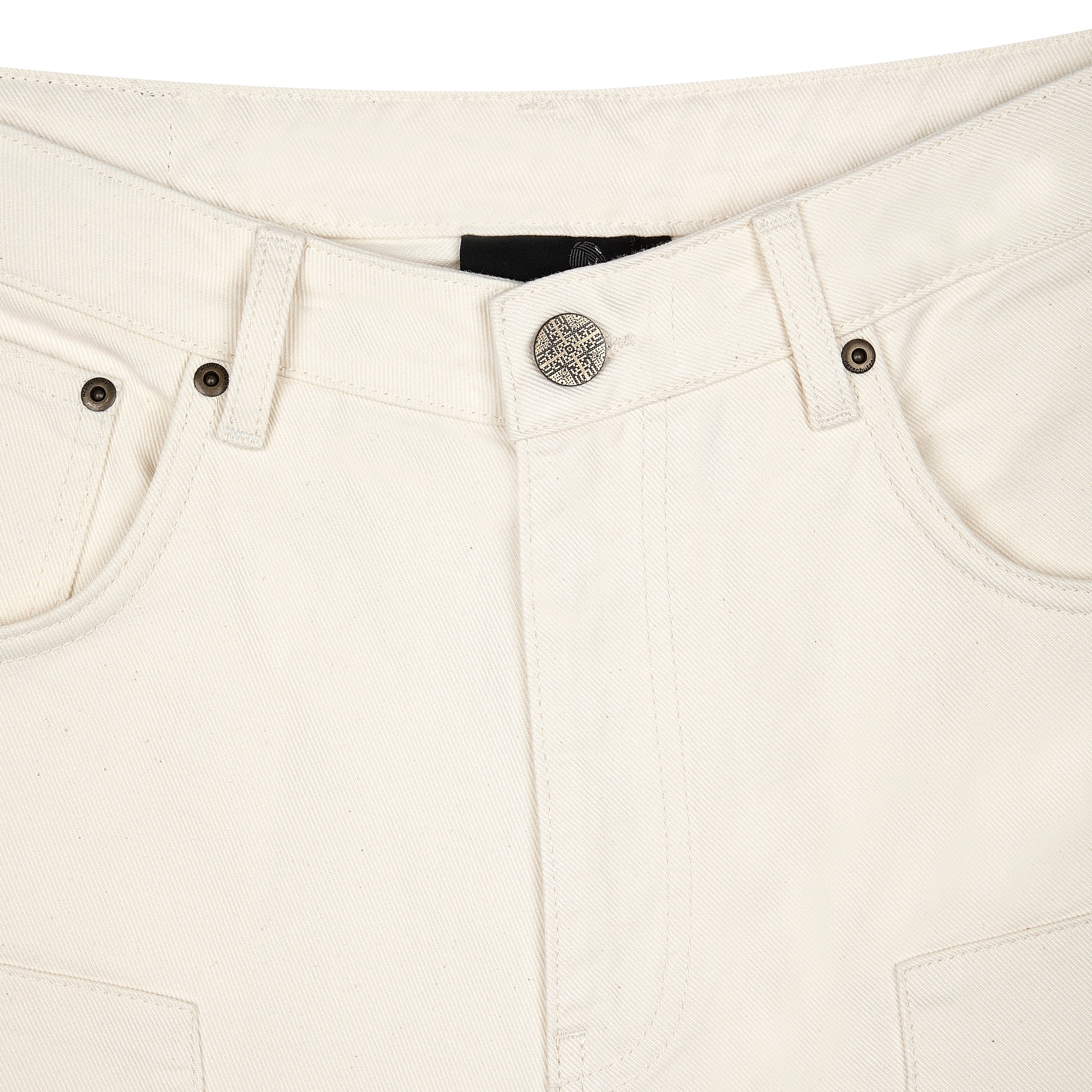 14,5oz denim / 100% cotton / embroidery on front panel / embroidered leather patch / custom button / wash inside out / fits true to size