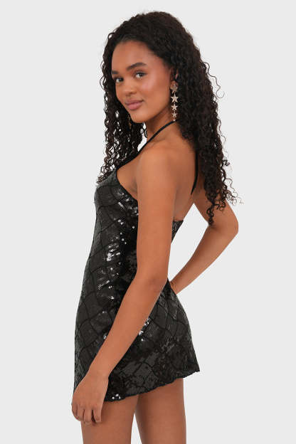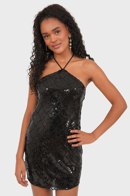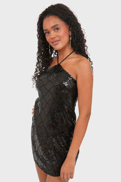 Get ready for the party season! 🪩 This black dress is the perfect party dress! ✨ The fitted silhouette and halter neck create a truly beautiful fit. Combined with the sequins, this is a true must-have for this season!