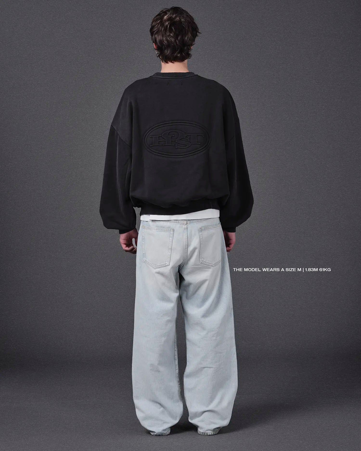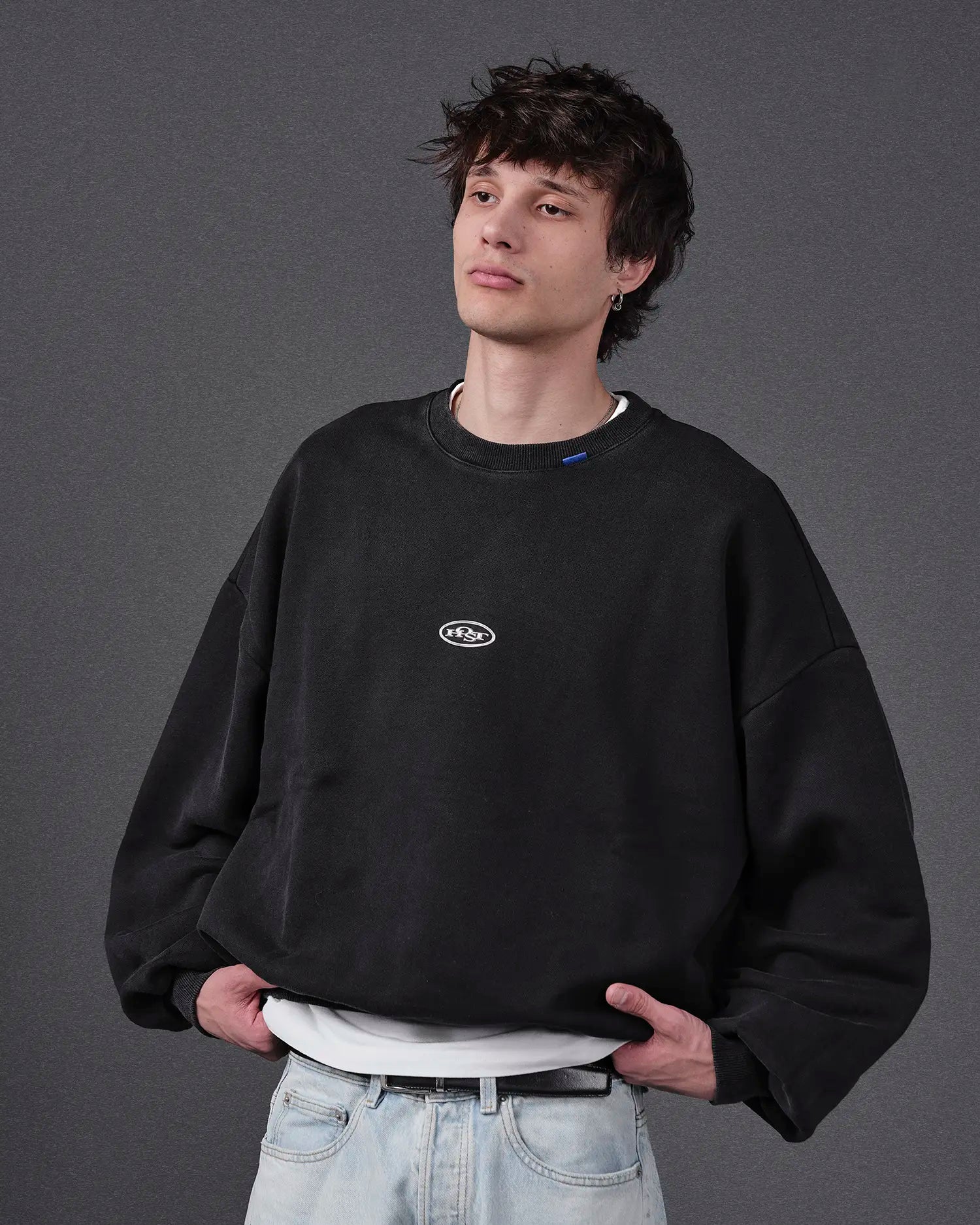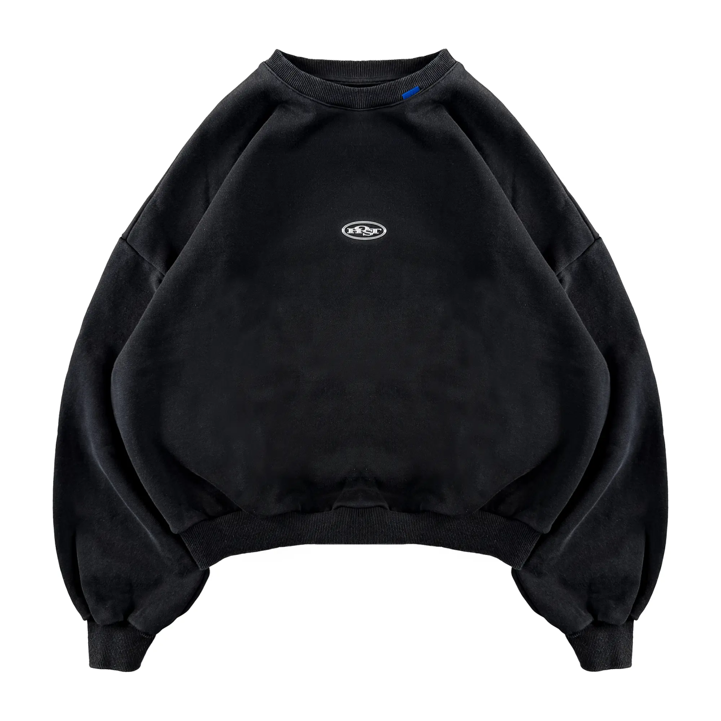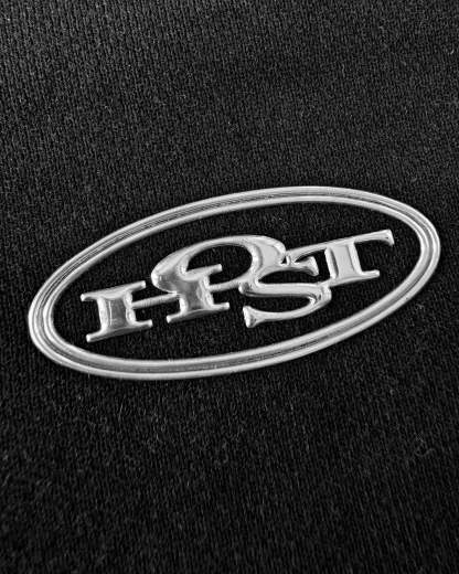 Washed black crewneck 'HOST' 3D silver finish patch on the front. ©Host corporate color collar label. 3D Embossed logo on the back.