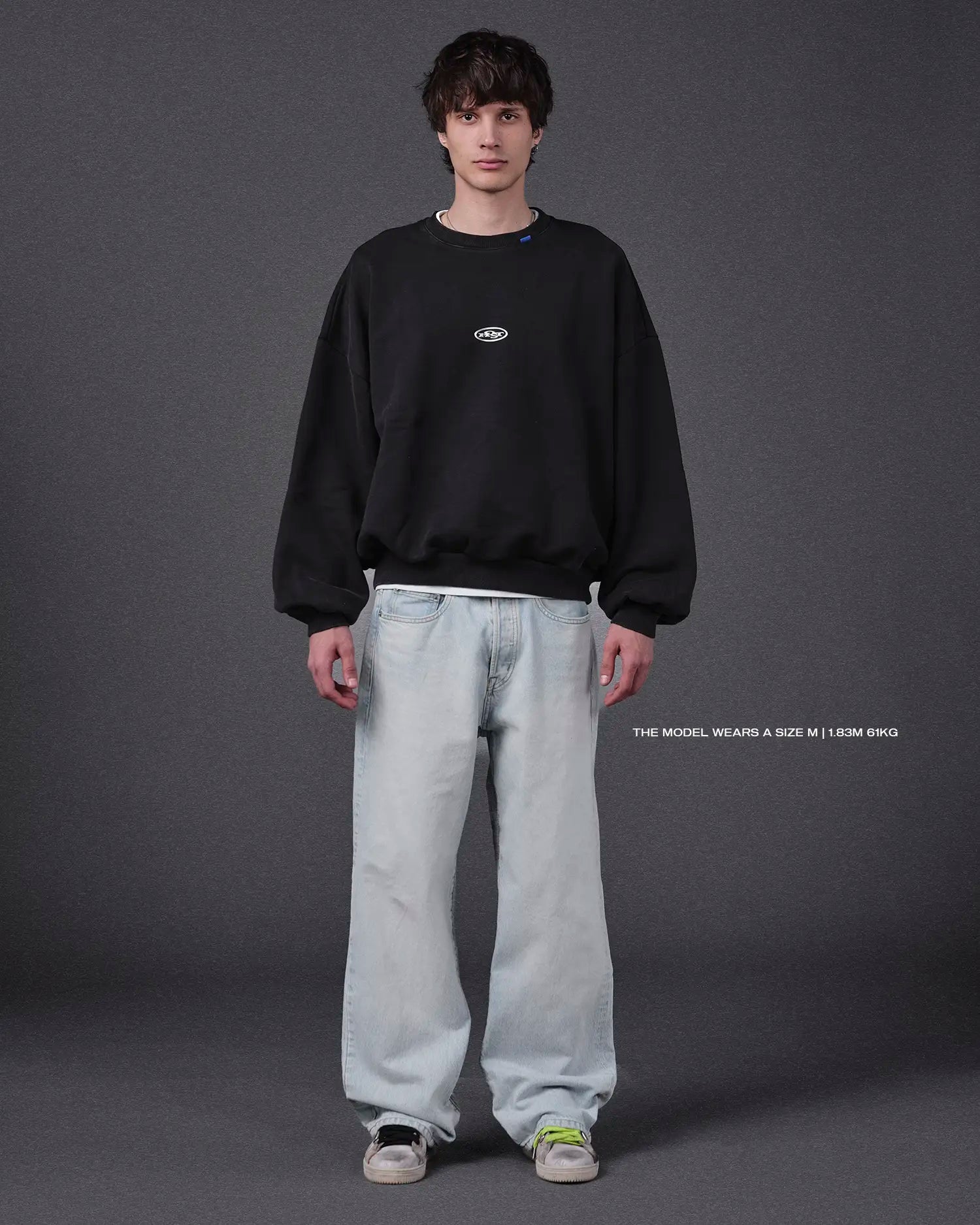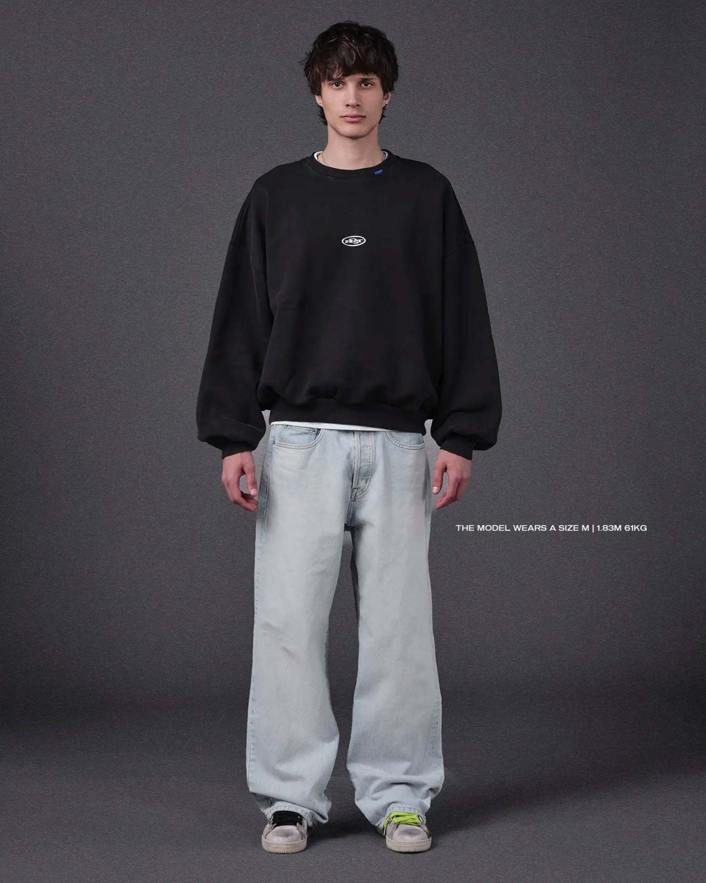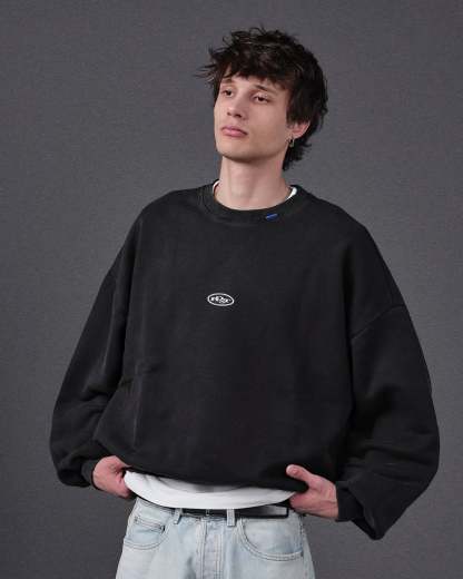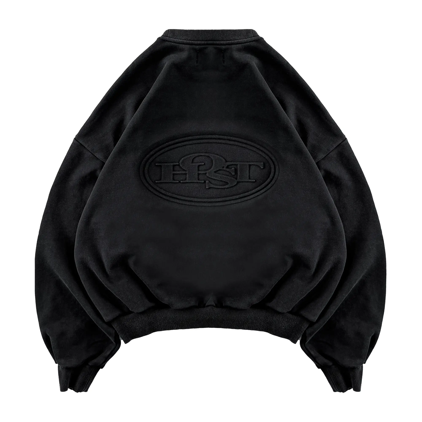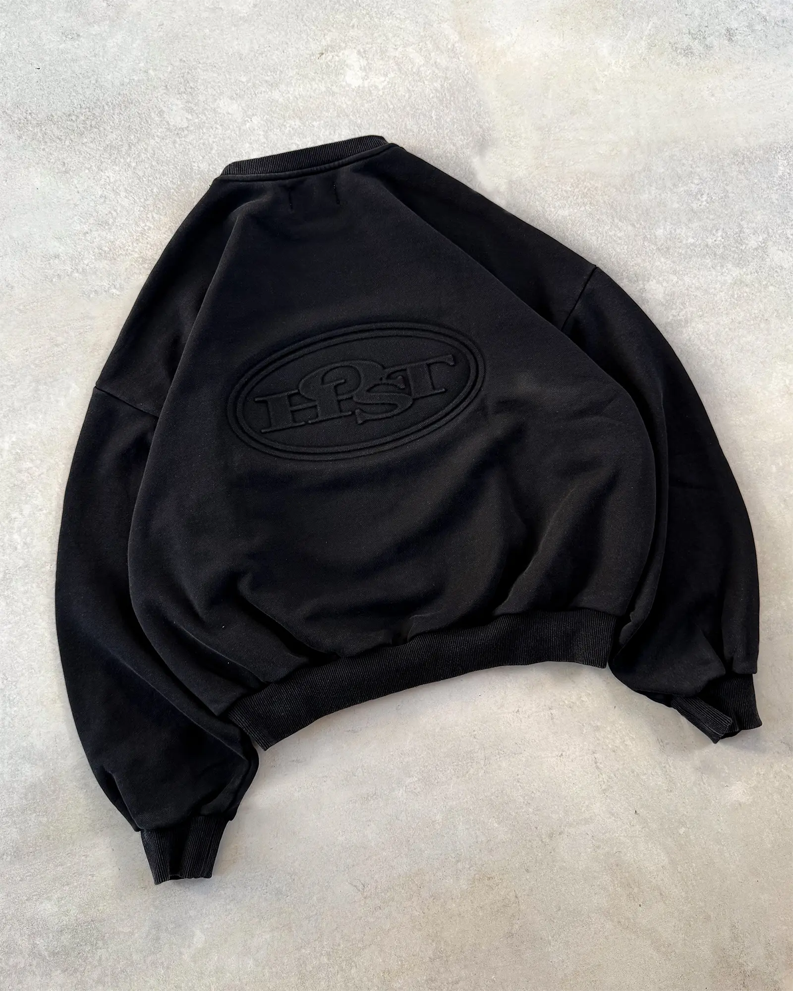 Washed black crewneck 'HOST' 3D silver finish patch on the front. ©Host corporate color collar label. 3D Embossed logo on the back.