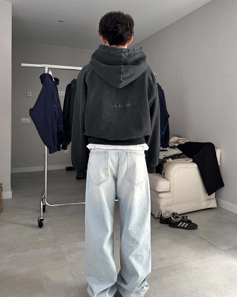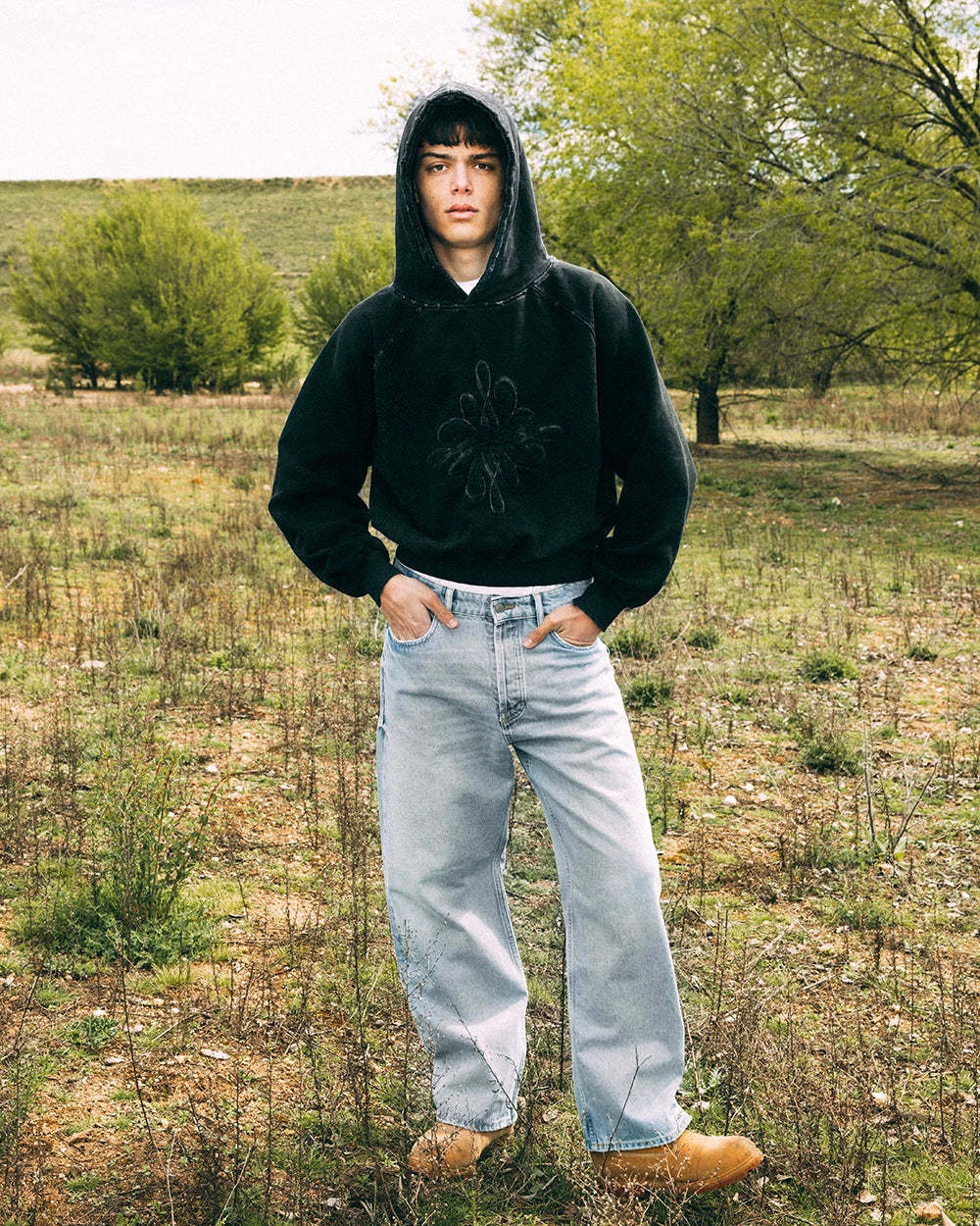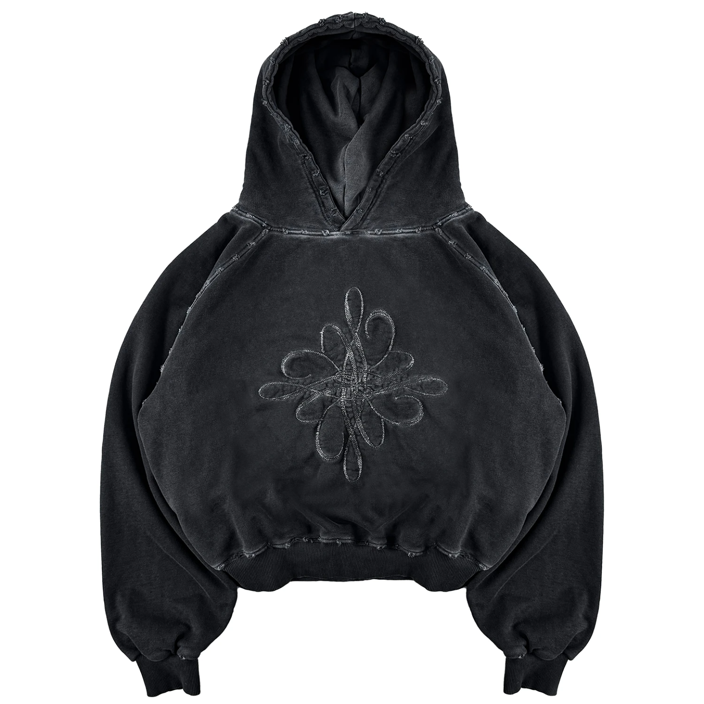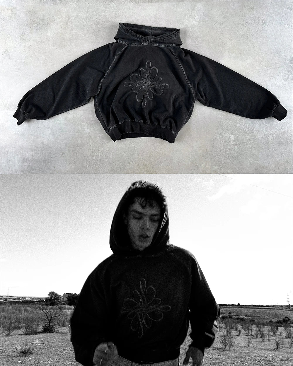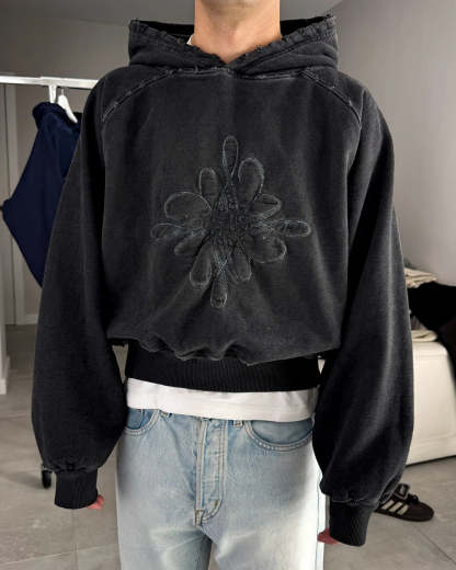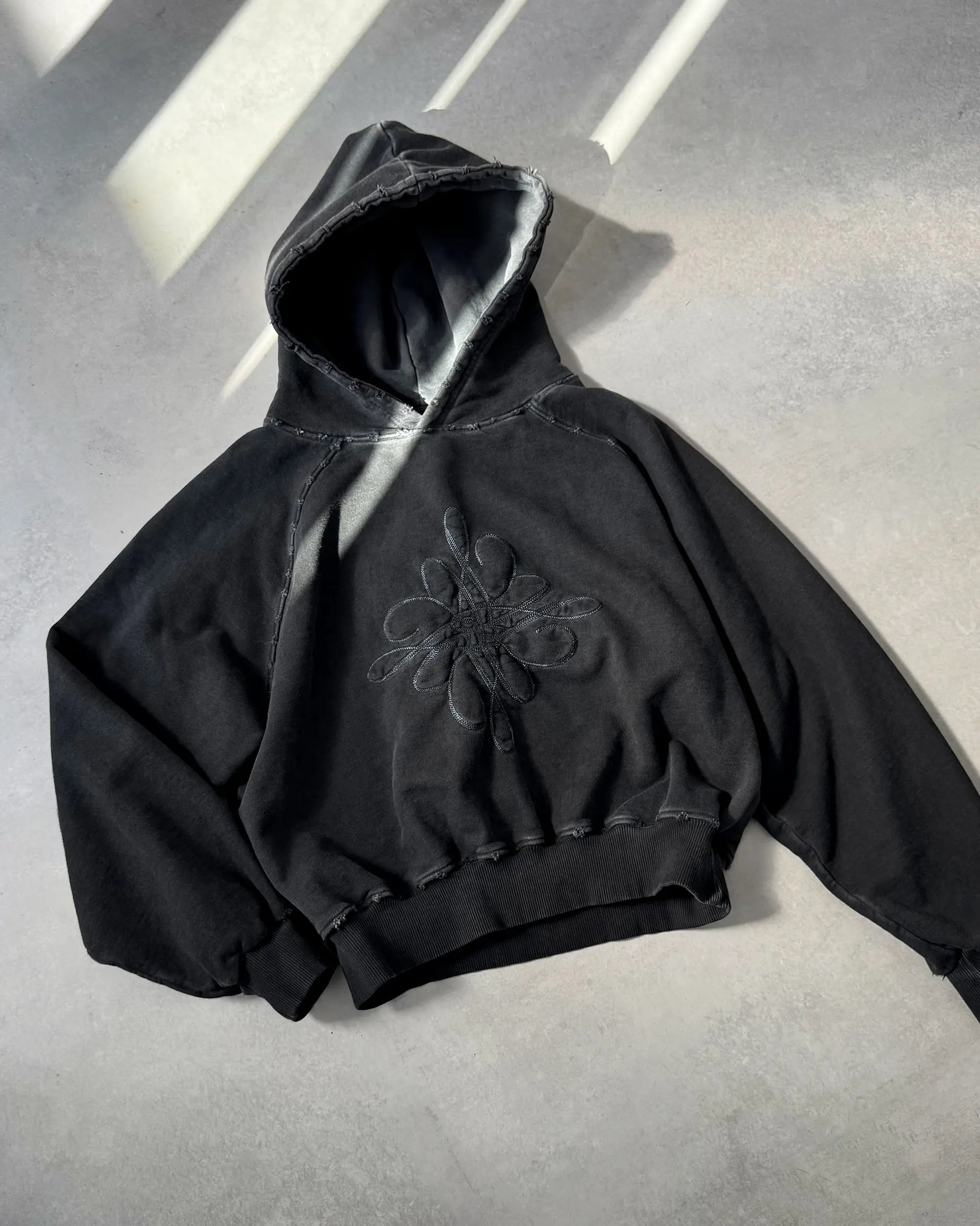 Dyed & washed vintage faded black hoodie 'ICONFLOWER logo' dyed color Chain Embroidered on the front. "LAMAISON" dyed color Chain embroidered on the back.