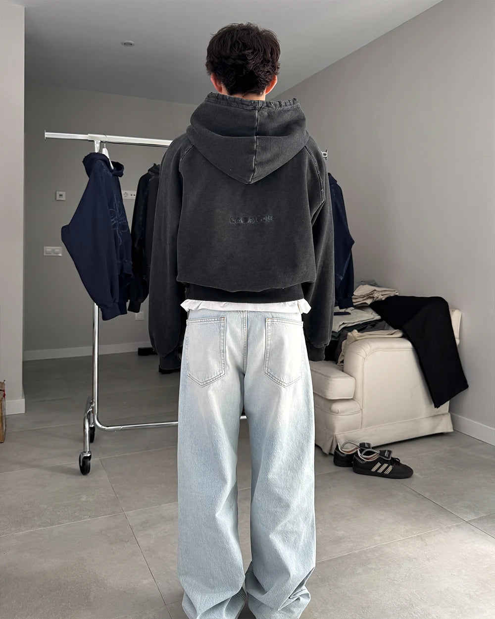 Ripped details throughout the garment. This piece has been reconstructed by hand generating this vintage effect. The color may vary slightly between different hoodies due to this effect.