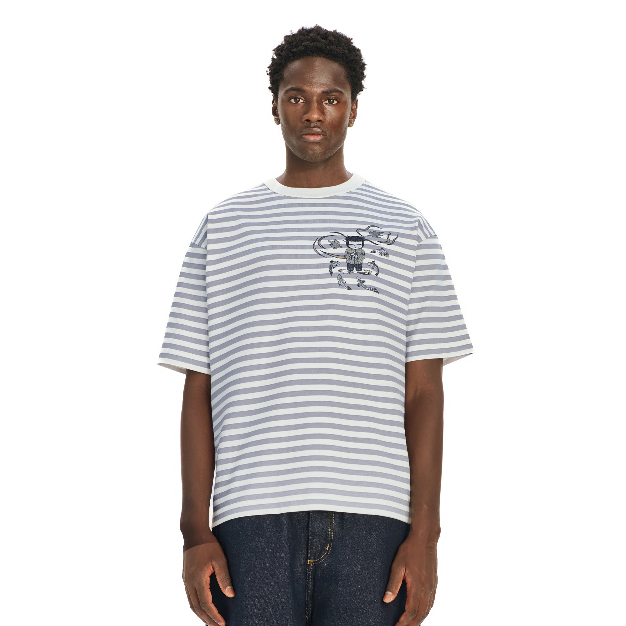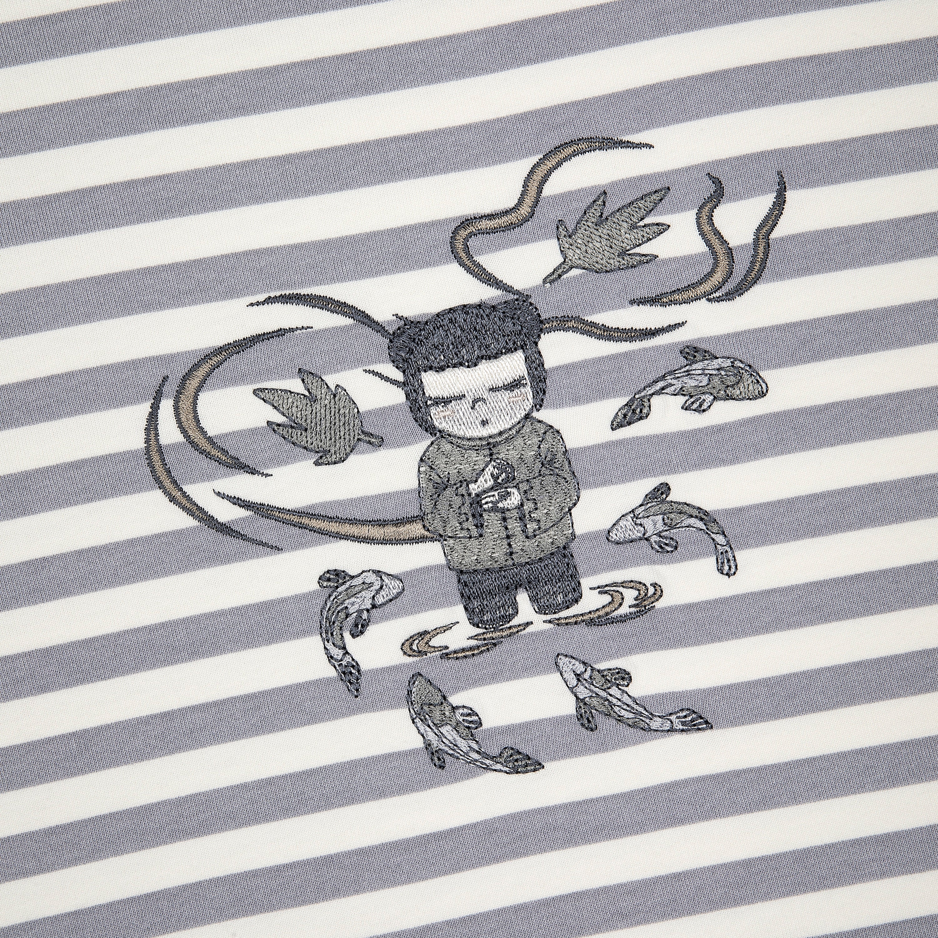 280gsm fabric / 100% preshrunk cotton / grey striped printed fabric / embroidery on front / fits true to size