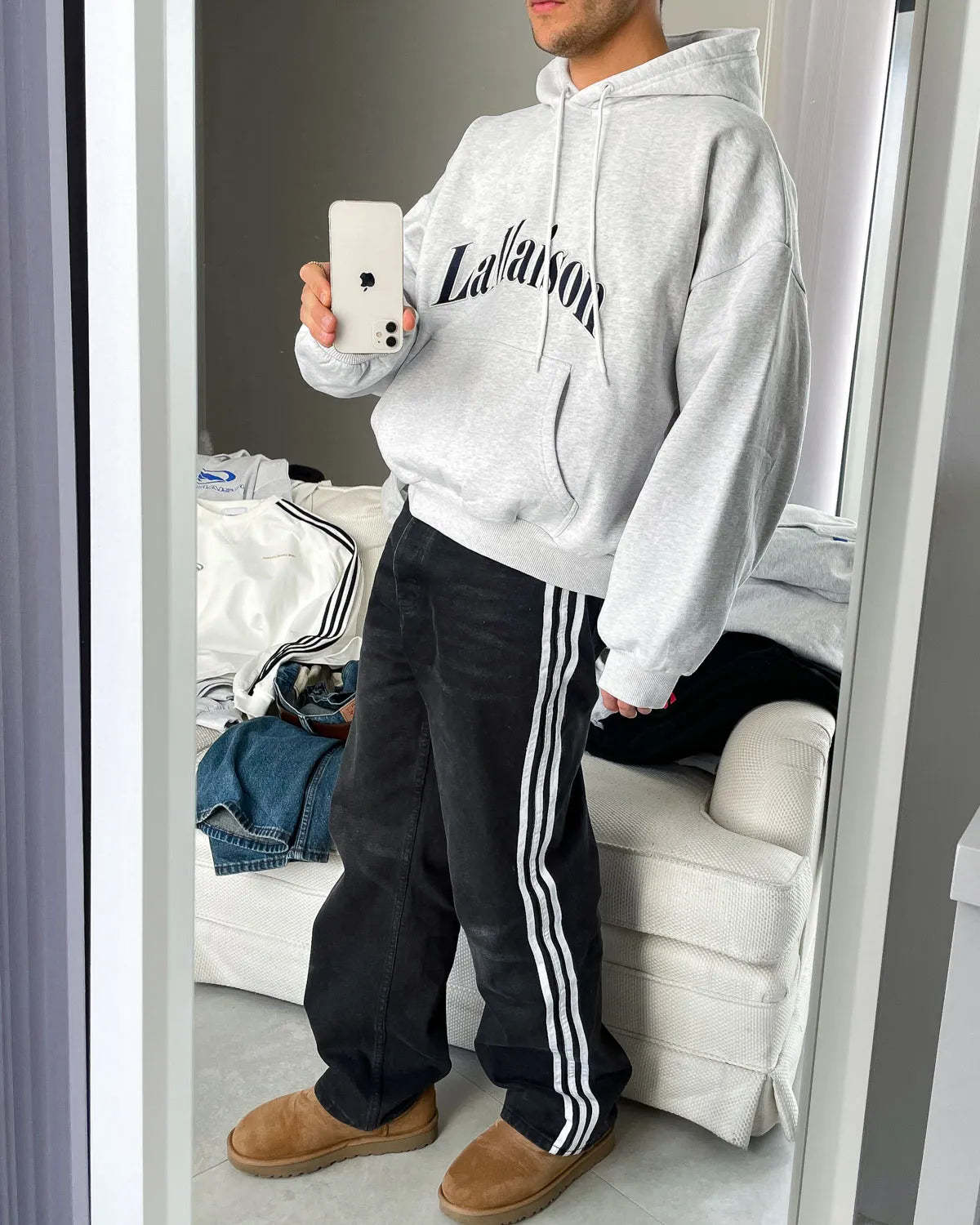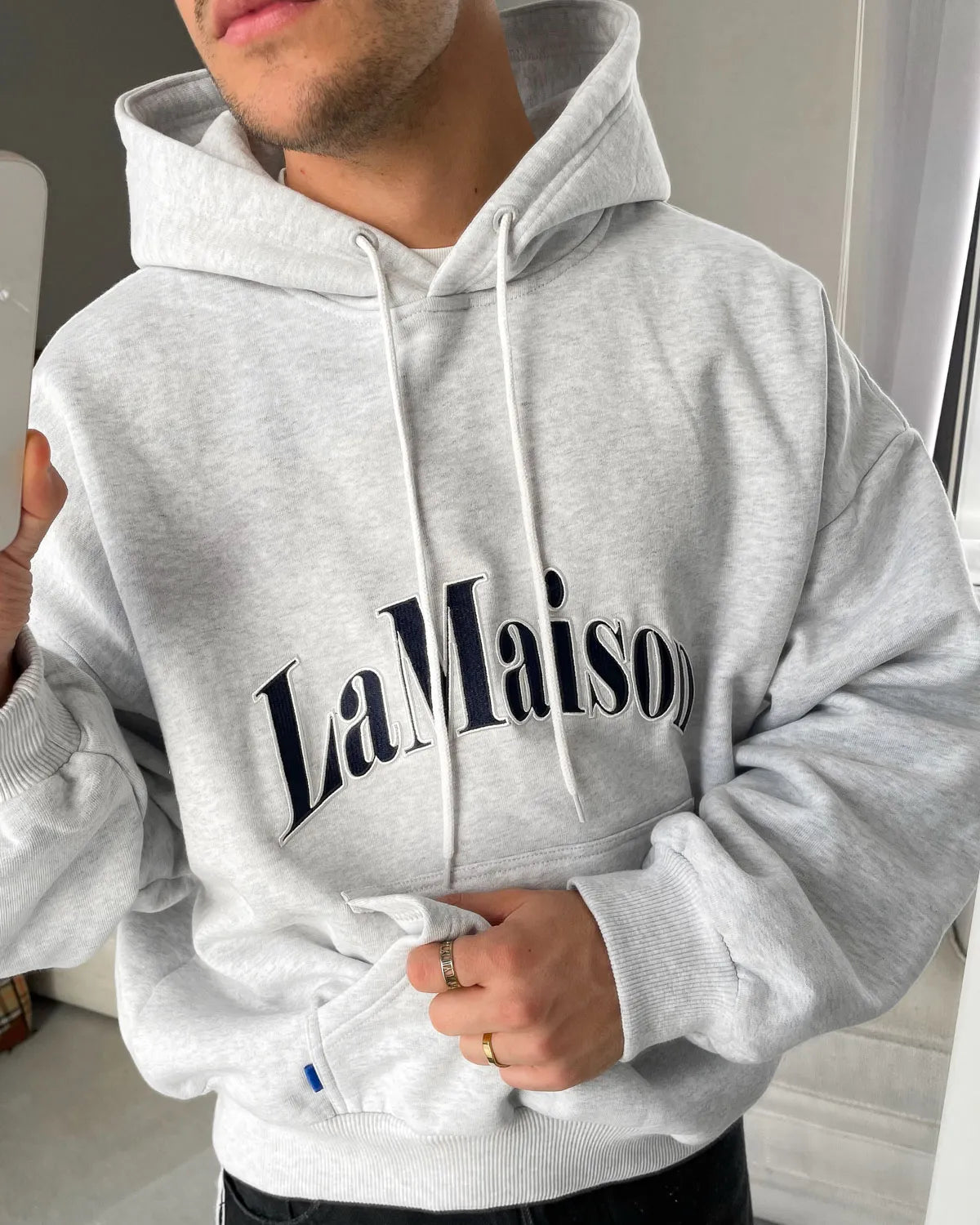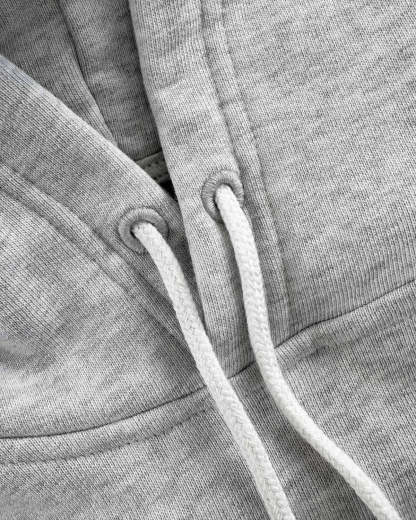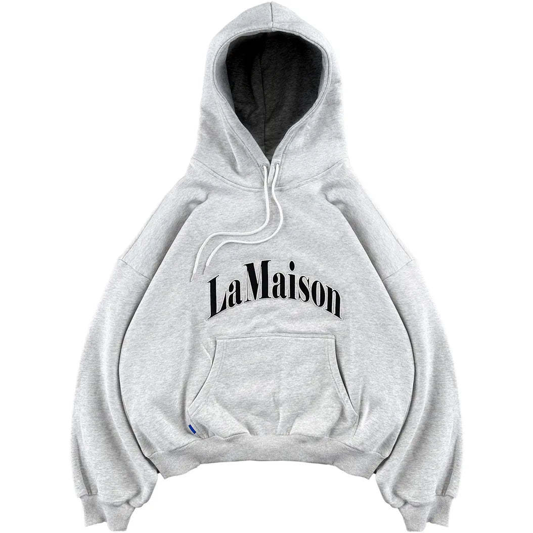 Ash grey hoodie 'LAMAISON' Dark navy blue 3D embroidery. Long cylindrical drawstrings. ©Host corporate color pocket label.