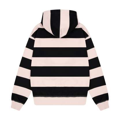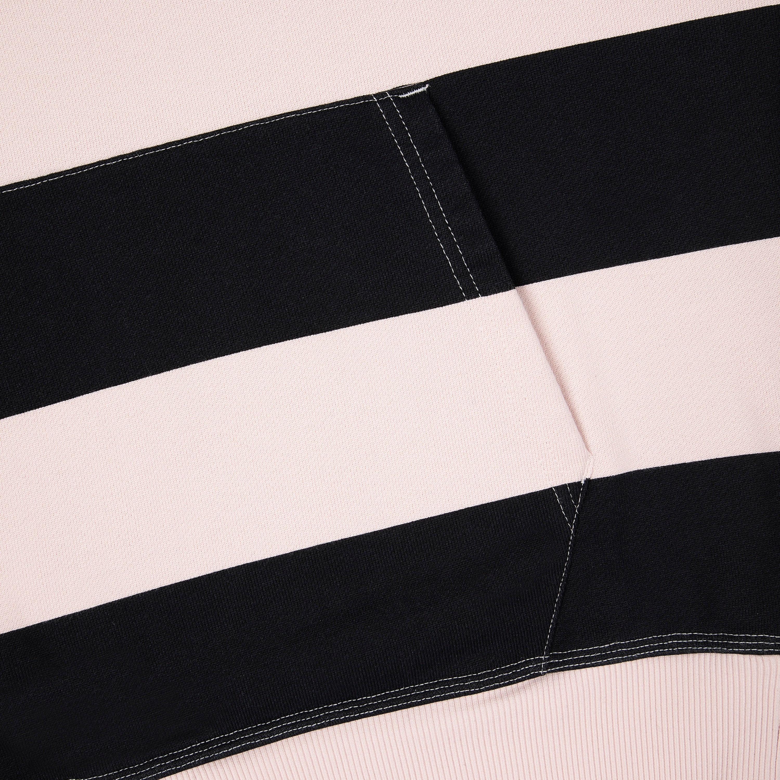 460gsm / 100% preshrunk cotton / purple printed stripes on pink fabric (wash and iron inside out at low heat) / embroidery on front / fits true to size