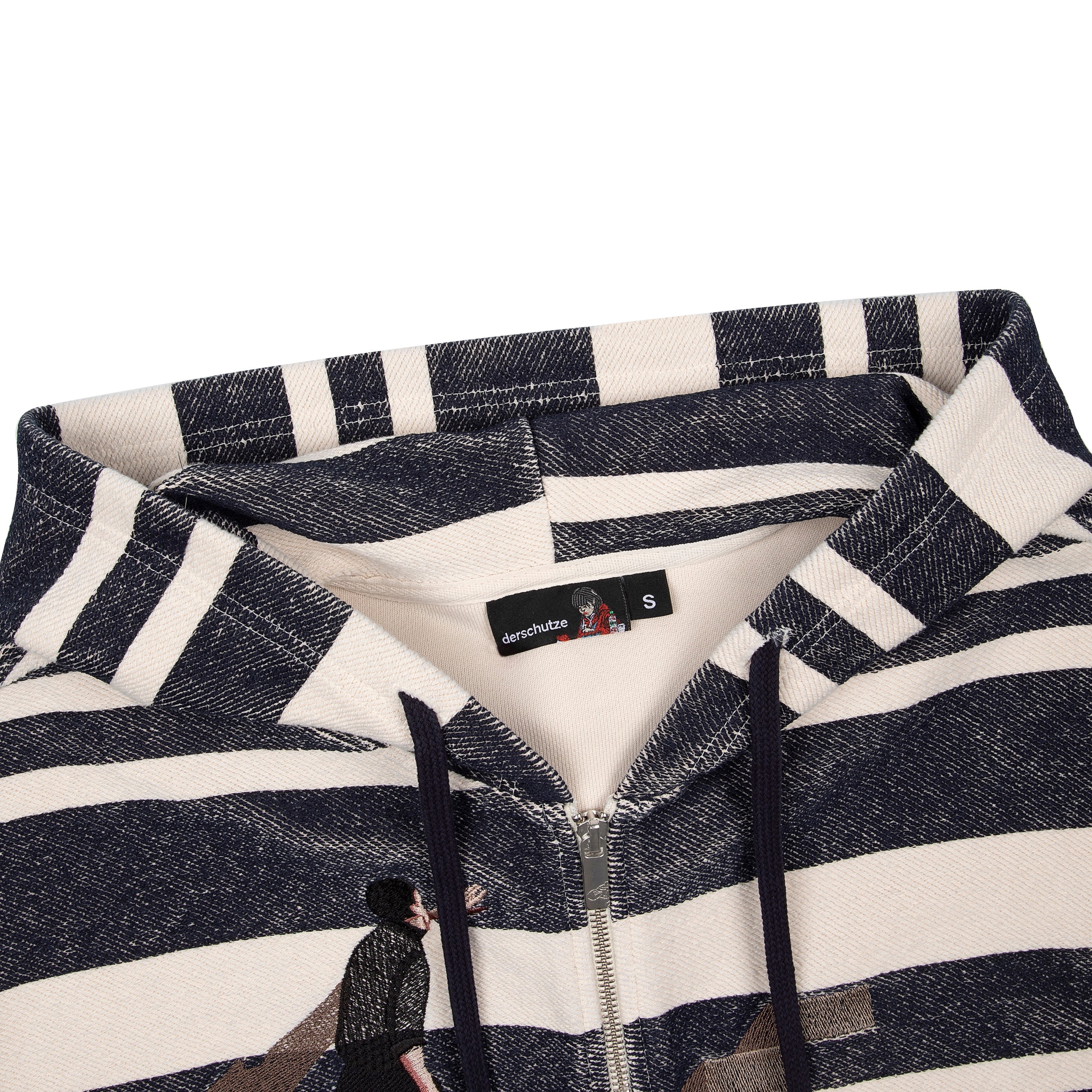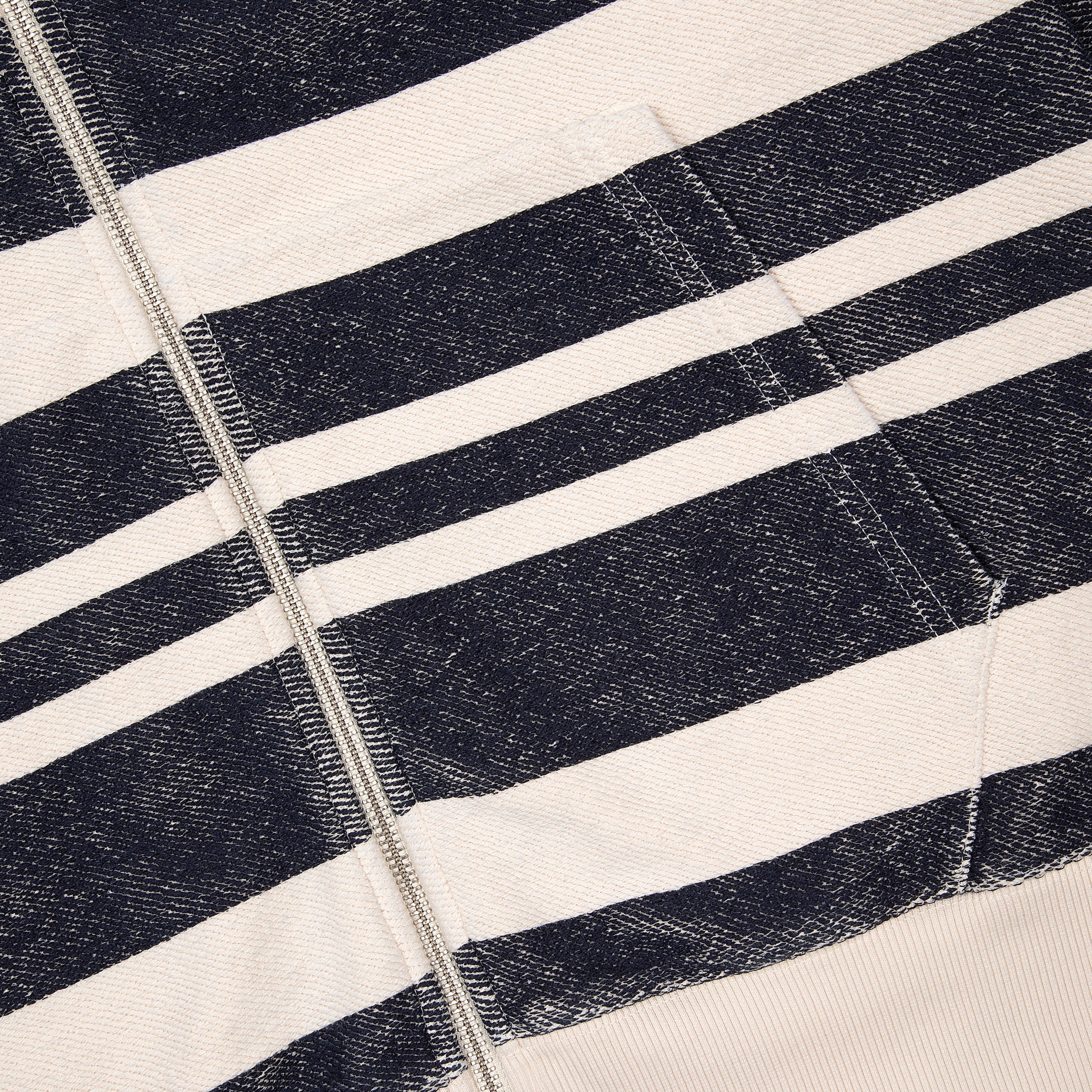 460gsm / 100% preshrunk cotton / reversed side of fabric used intentionally / printed stripes (wash and iron inside out at low heat) / embroidery on front / with double-slided YKK zipper / fits true to size