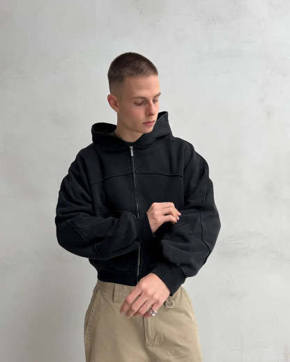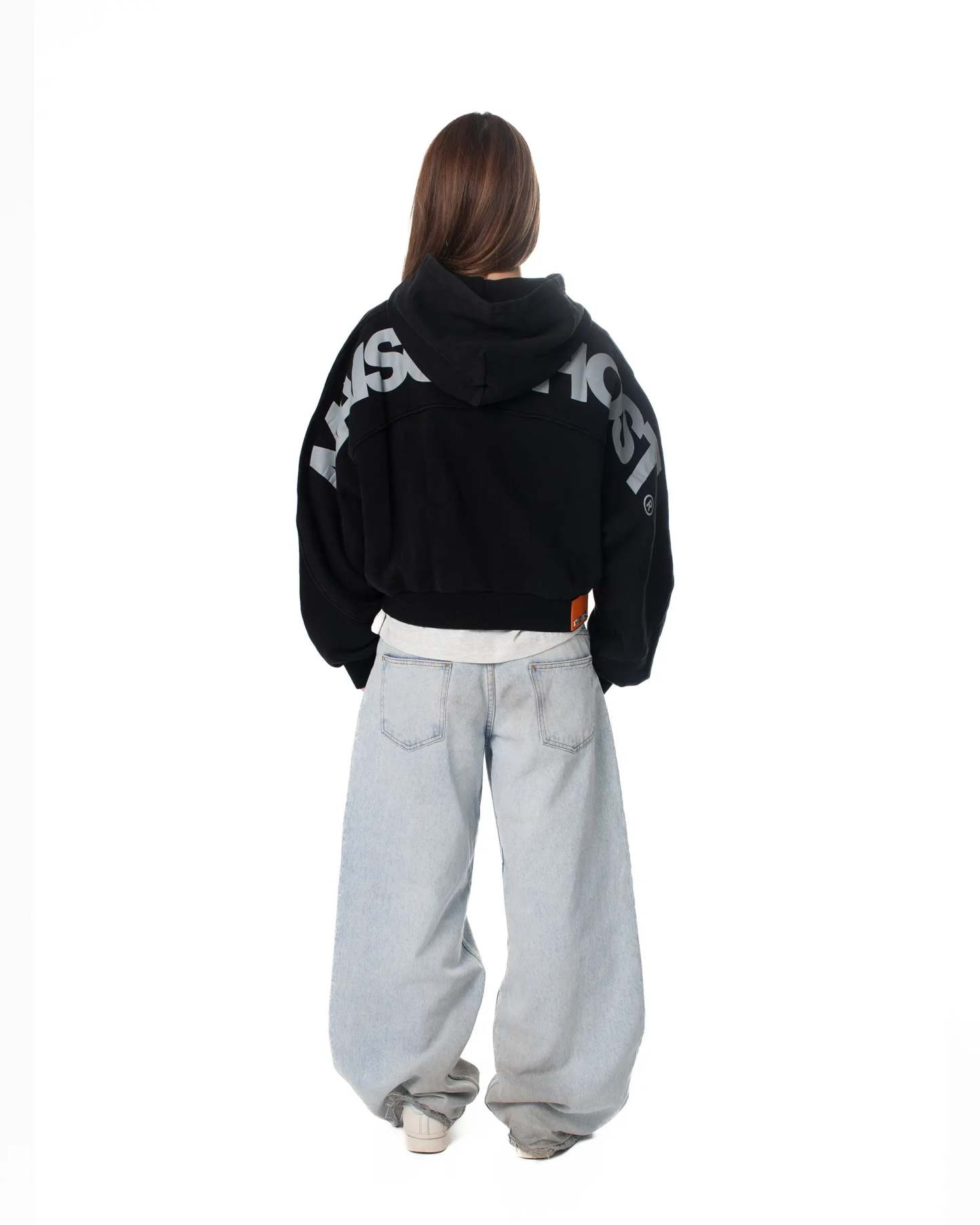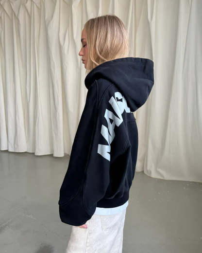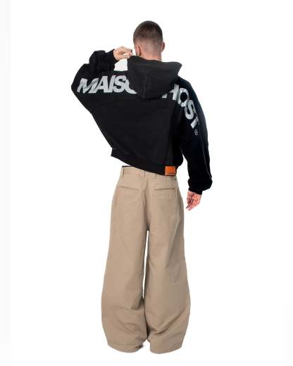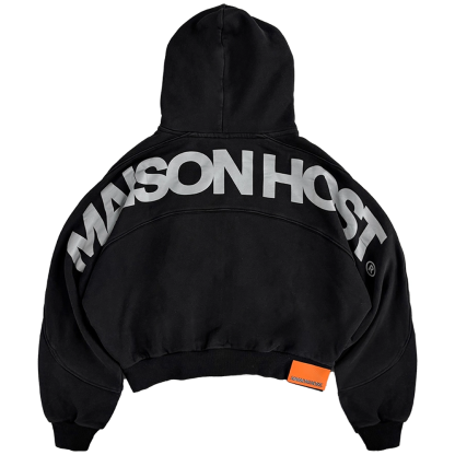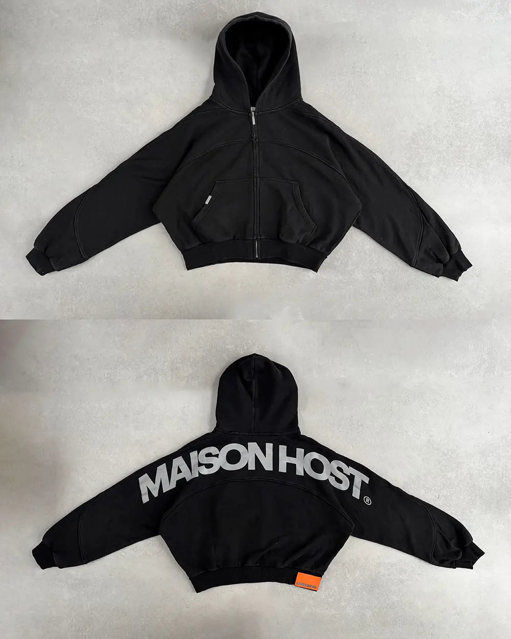 Features a full-length metal zipper, curved seam construction, and an oversized MAISON HOST® back print running from the left sleeve across the hood to the right sleeve. Includes a metallic MAISONHOST® side tag on the pocket and an orange leather patch with embedded metal lettering on the back waist.