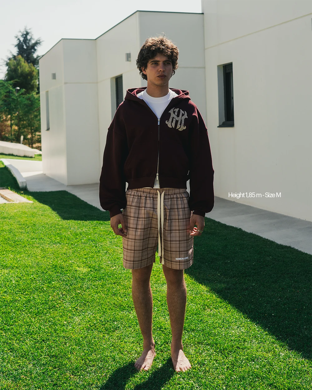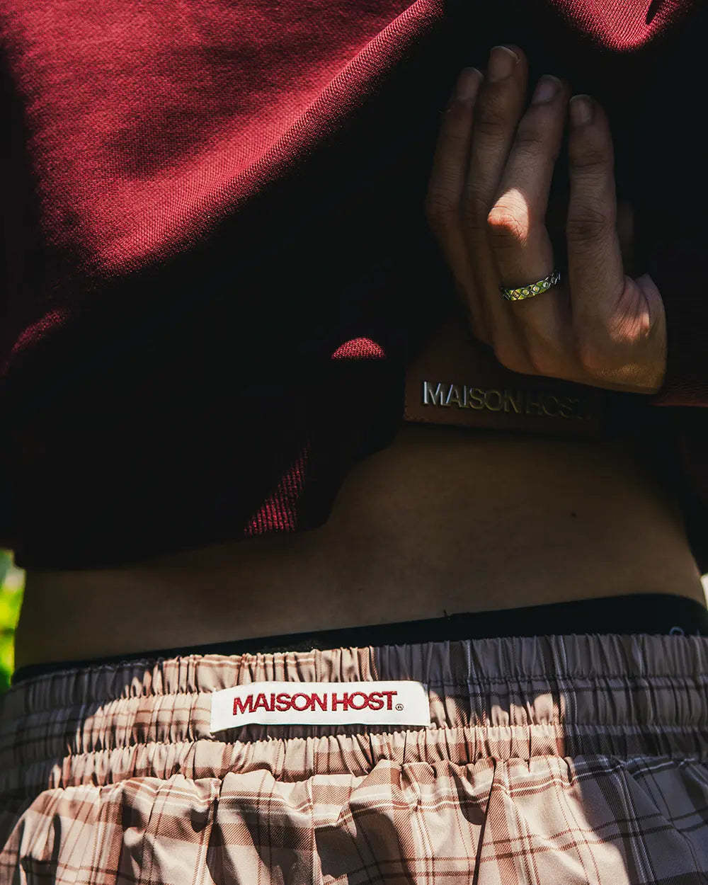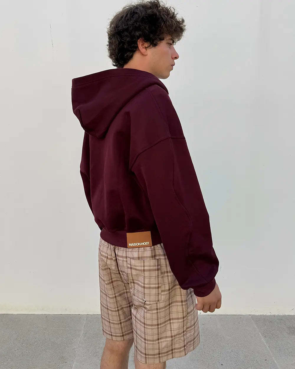 Features a front digital print with the MH monogram on the chest. Double zipper detailed with MaisonHost® engraving, wavy-arm seam construction, and a premium leather patch on the back with metallic MaisonHost® lettering.