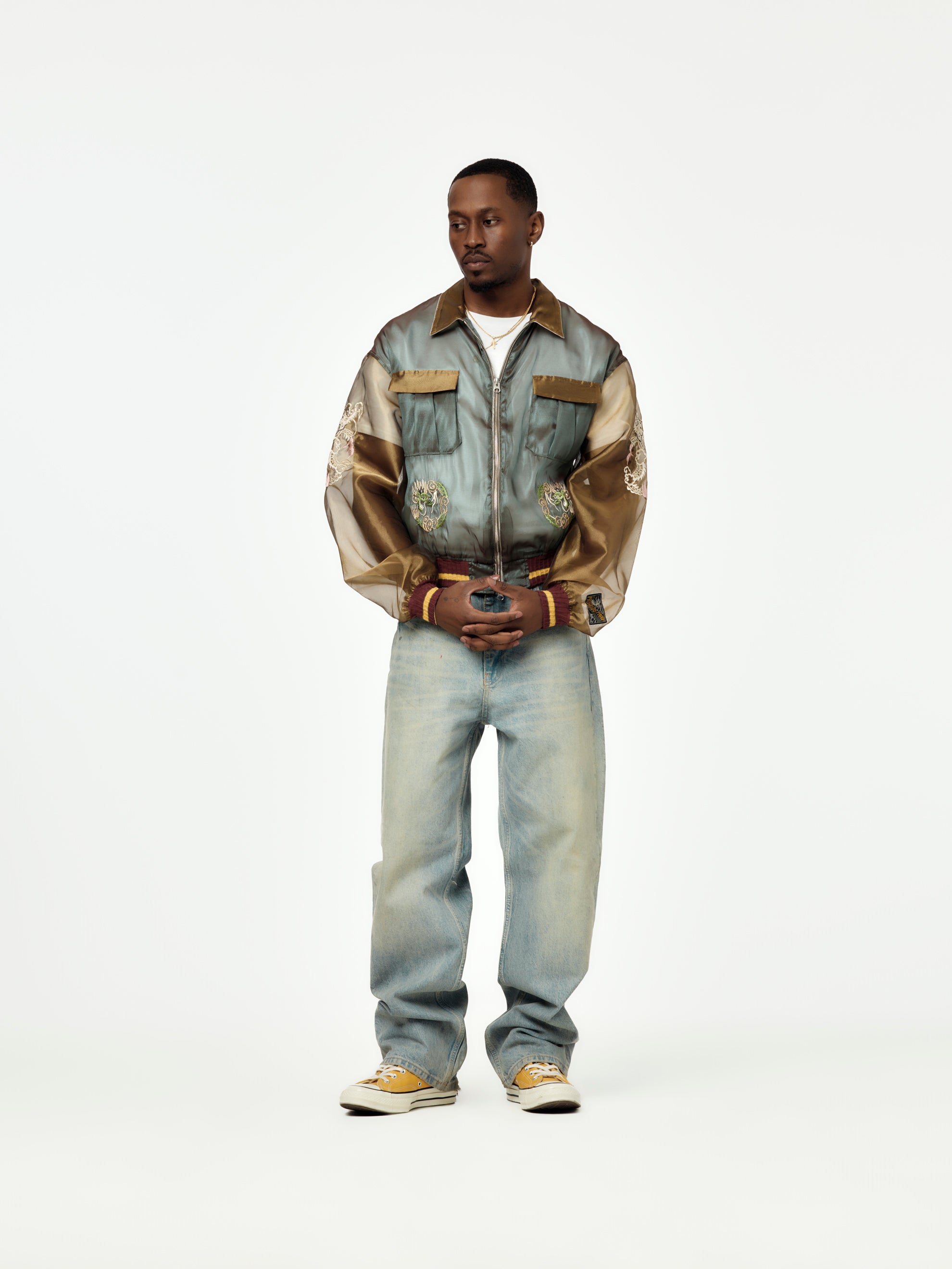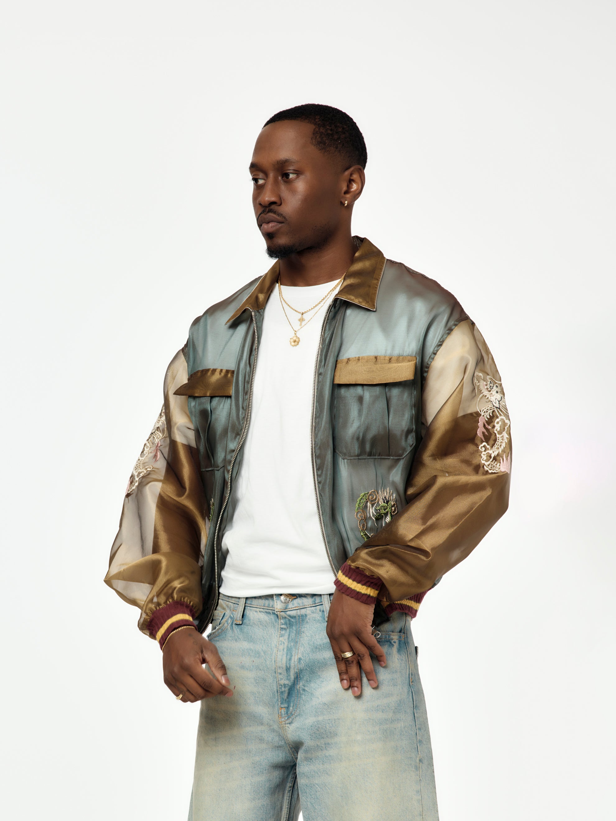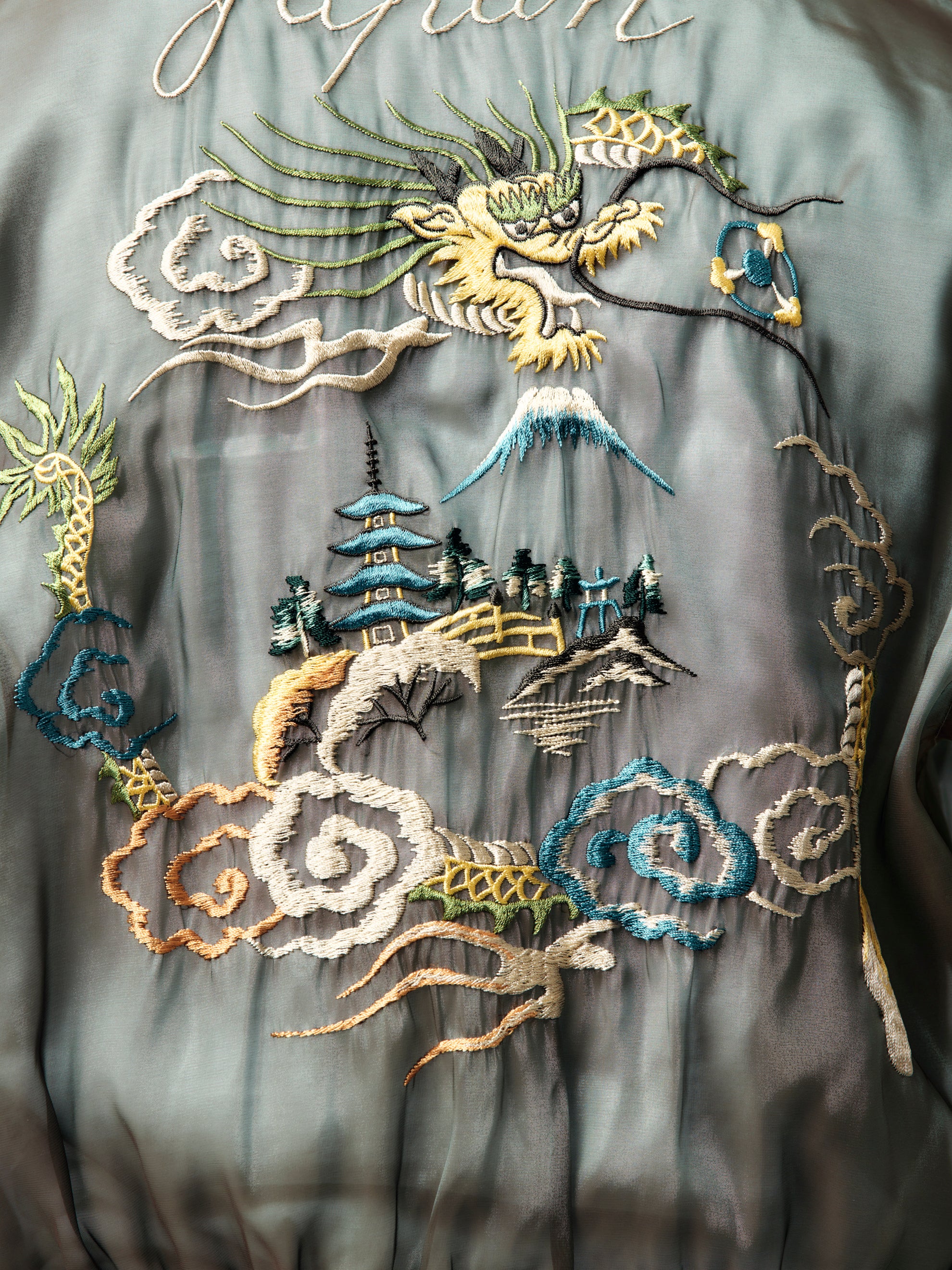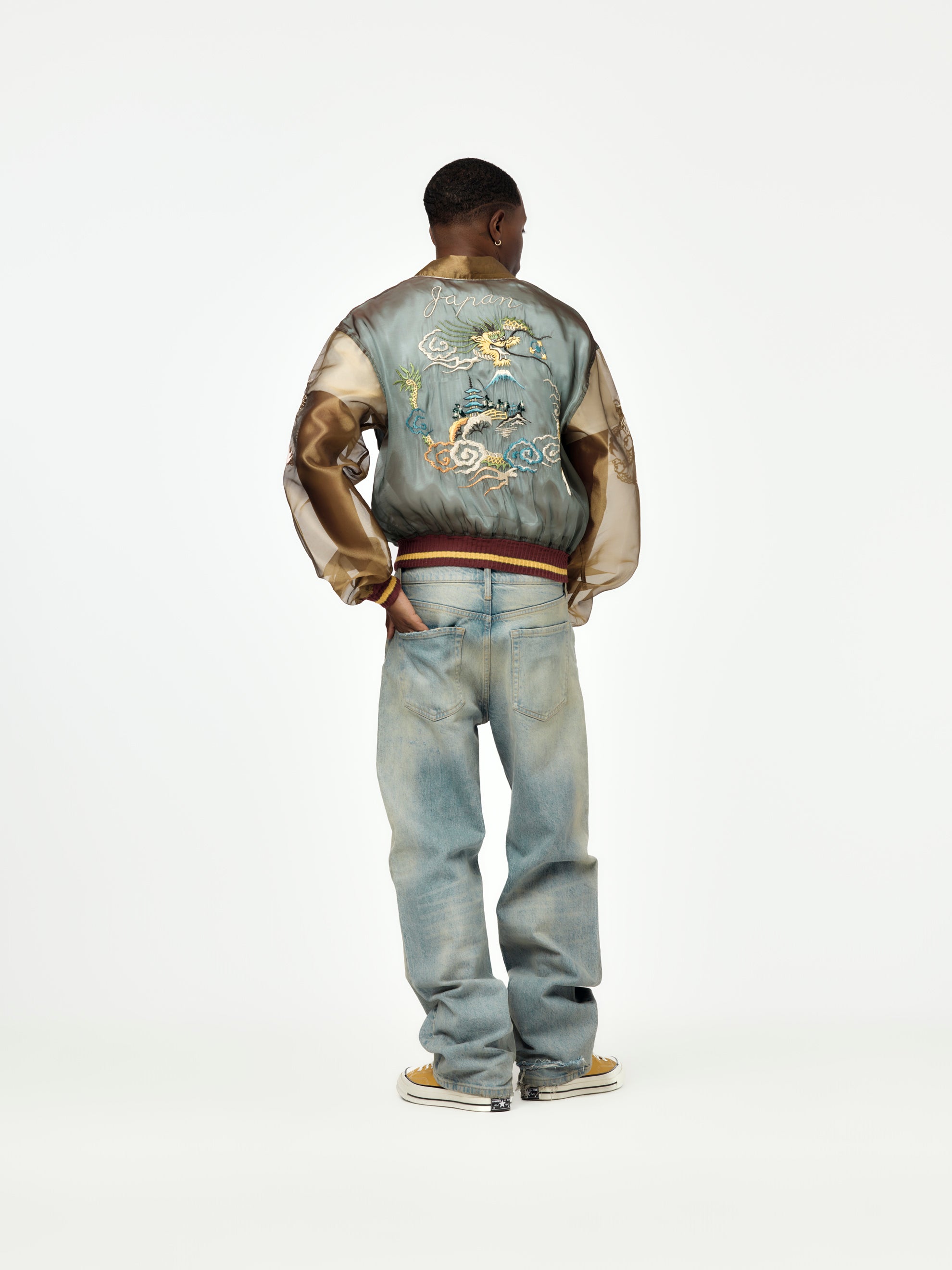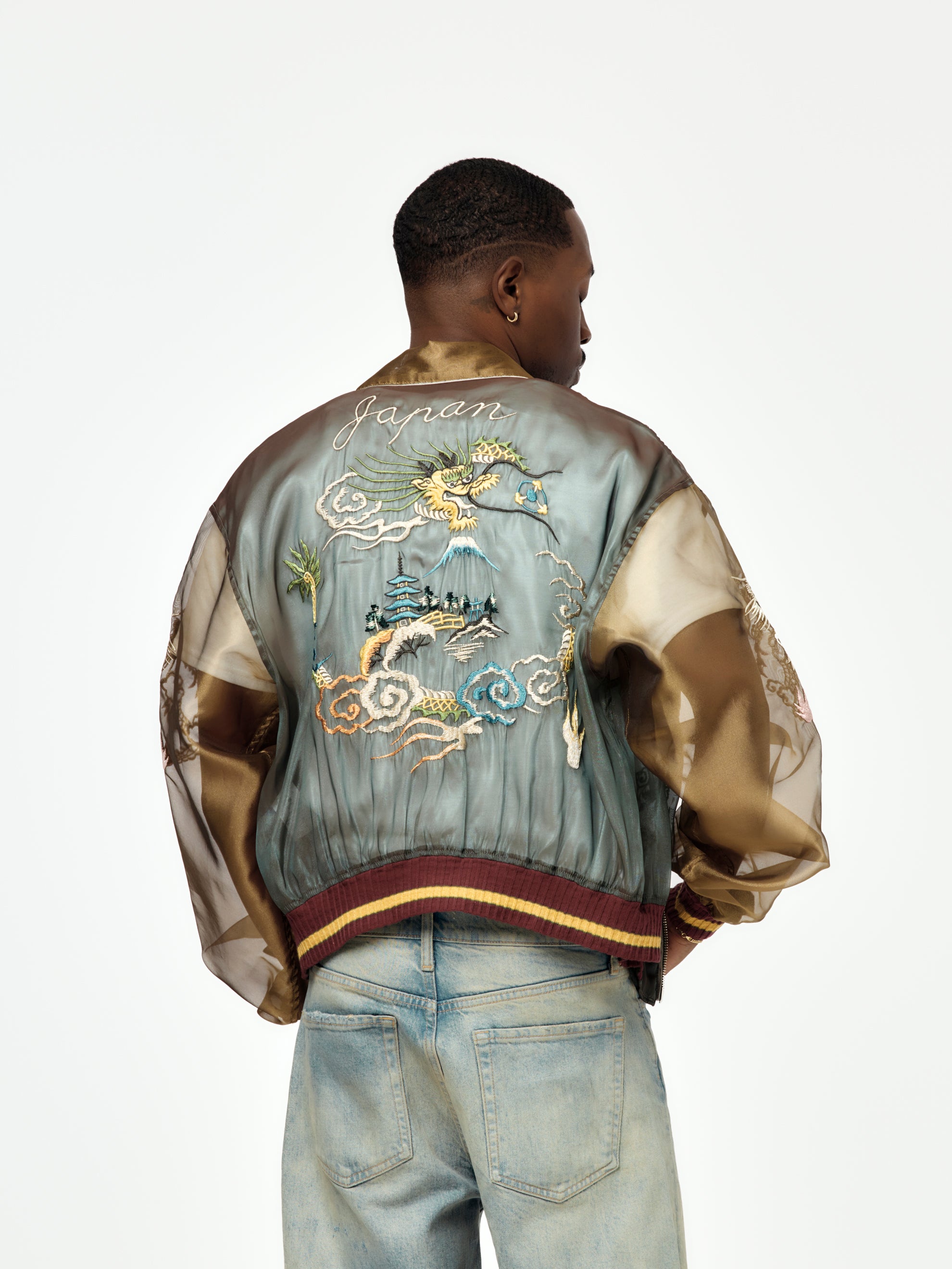 KAPITAL flips the script again with the Sheer Pearl Mosquito Guard 2TONES Vietnam JKT. This statement piece features a translucent, lightweight fabrication that shows just enough skin and layering underneath—perfect for warm weather with edge. A subtle sheen and smooth hand-feel elevate the two-tone construction, while bold dragon embroidery leans into vintage souvenir jacket energy. Packed with volume, attitude, and intention—this one’s made to stand out. Comes with a matching storage pouch.
