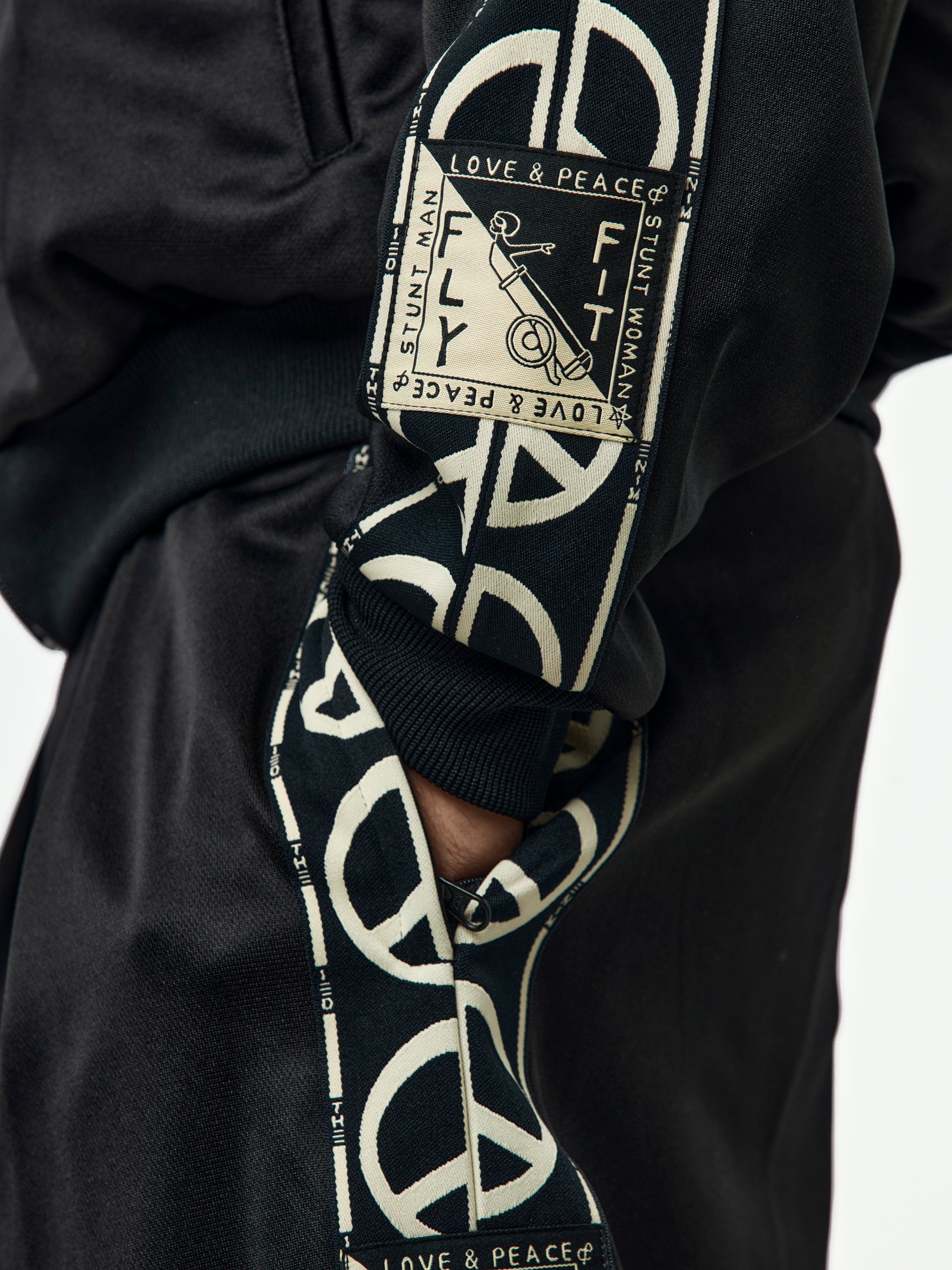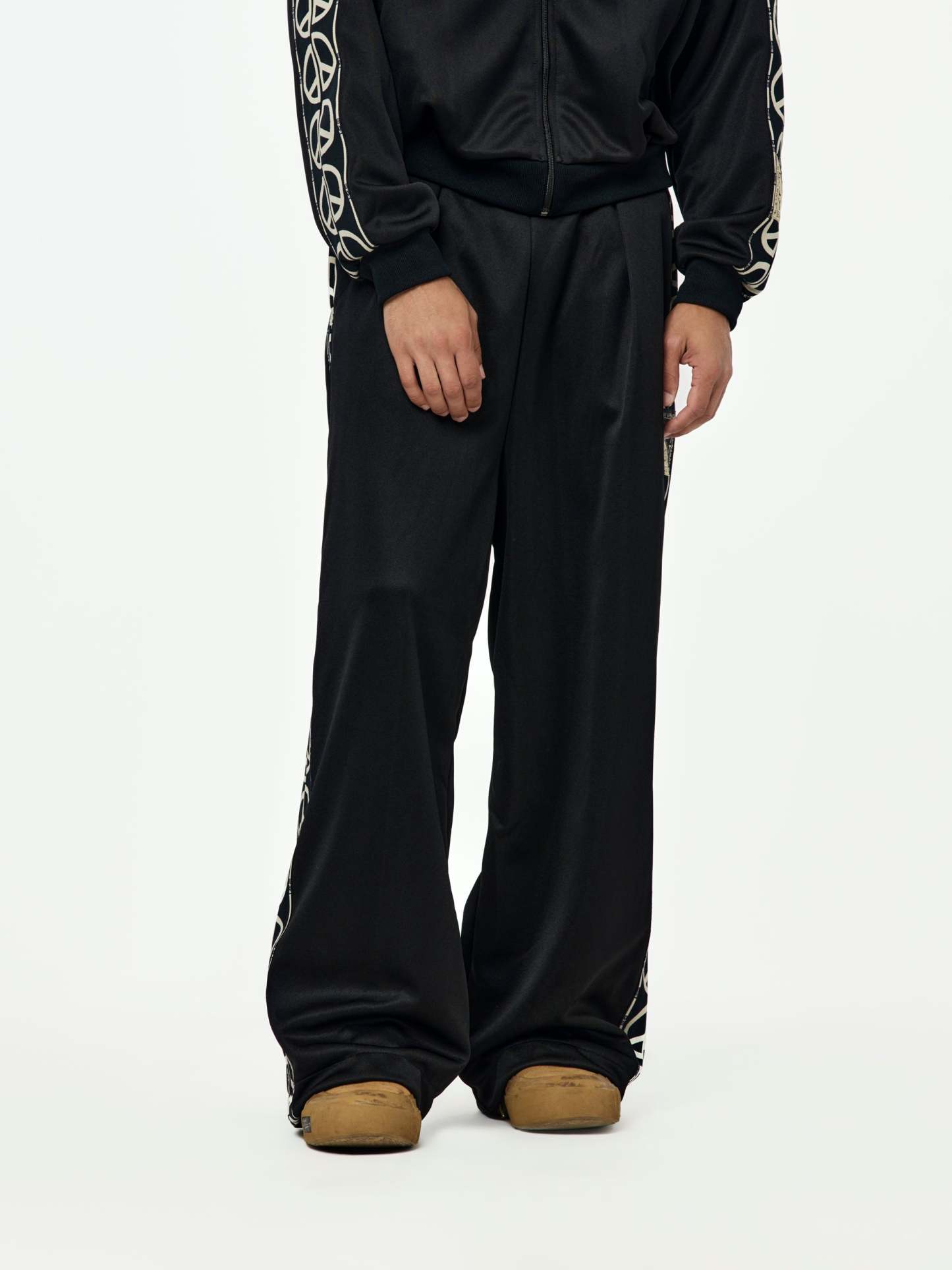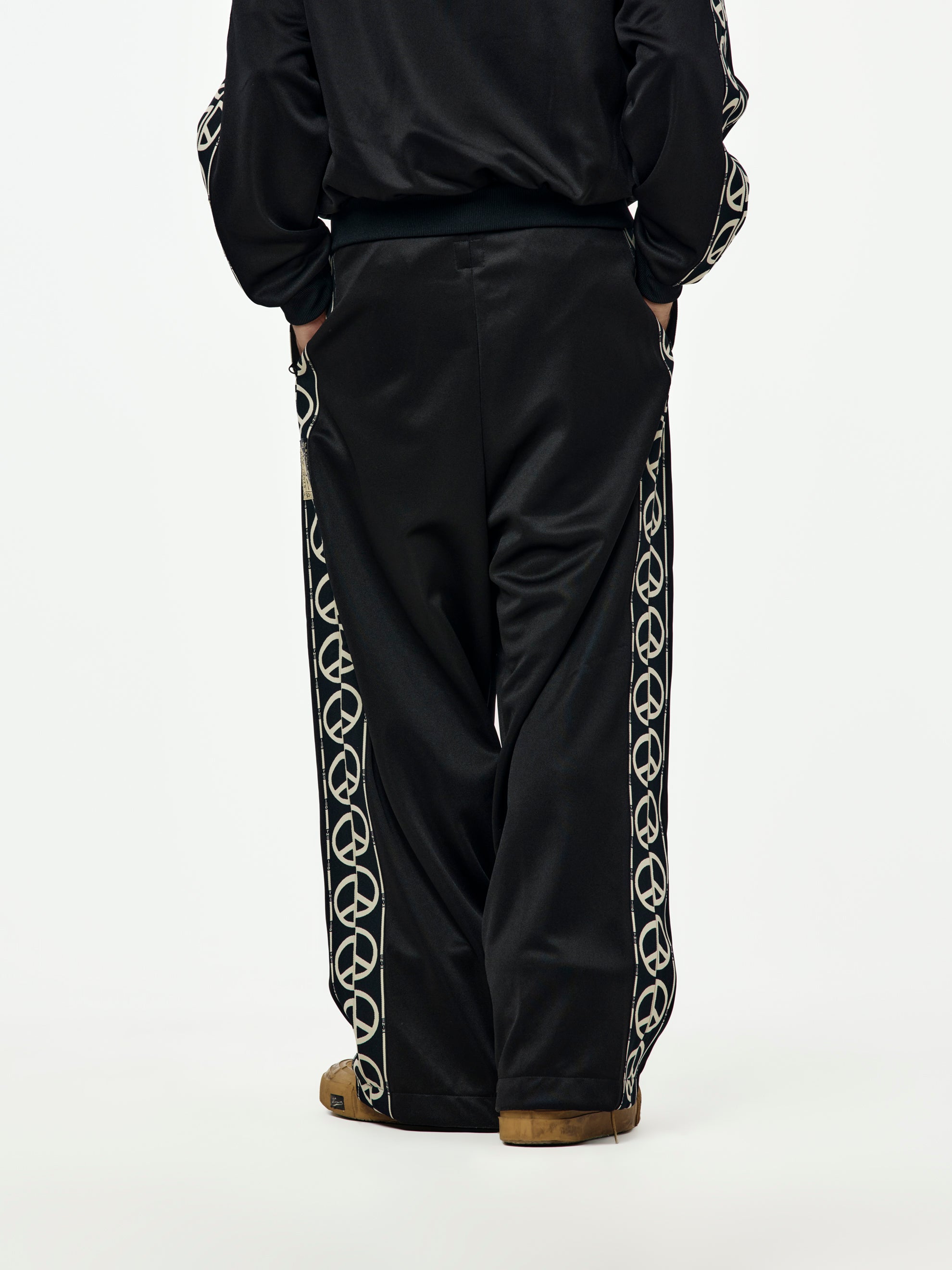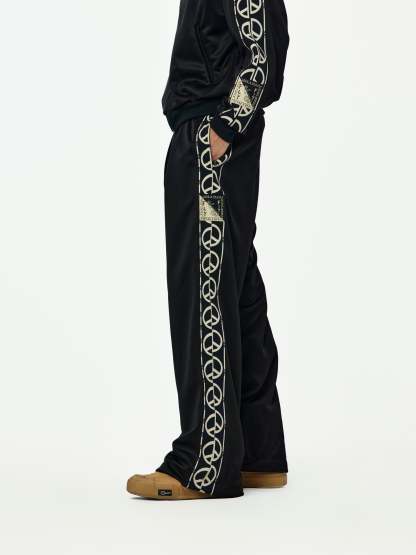 Laid-back meets layered meaning. These KAPITAL baggy track pants flip the familiar with a mirrored “D” motif and peace sign tape running the sides. Cut from a soft, smooth jersey, they land relaxed and easy with an in-tucked, compact waistband for structure. Elastic waist with drawcord for the right fit—loose where it counts. Pairs well with everything and says a little something while doing it.