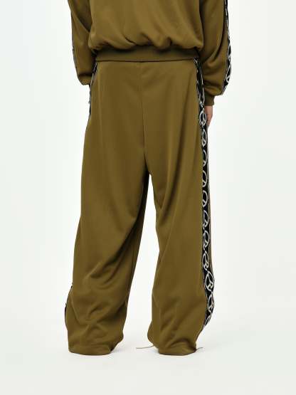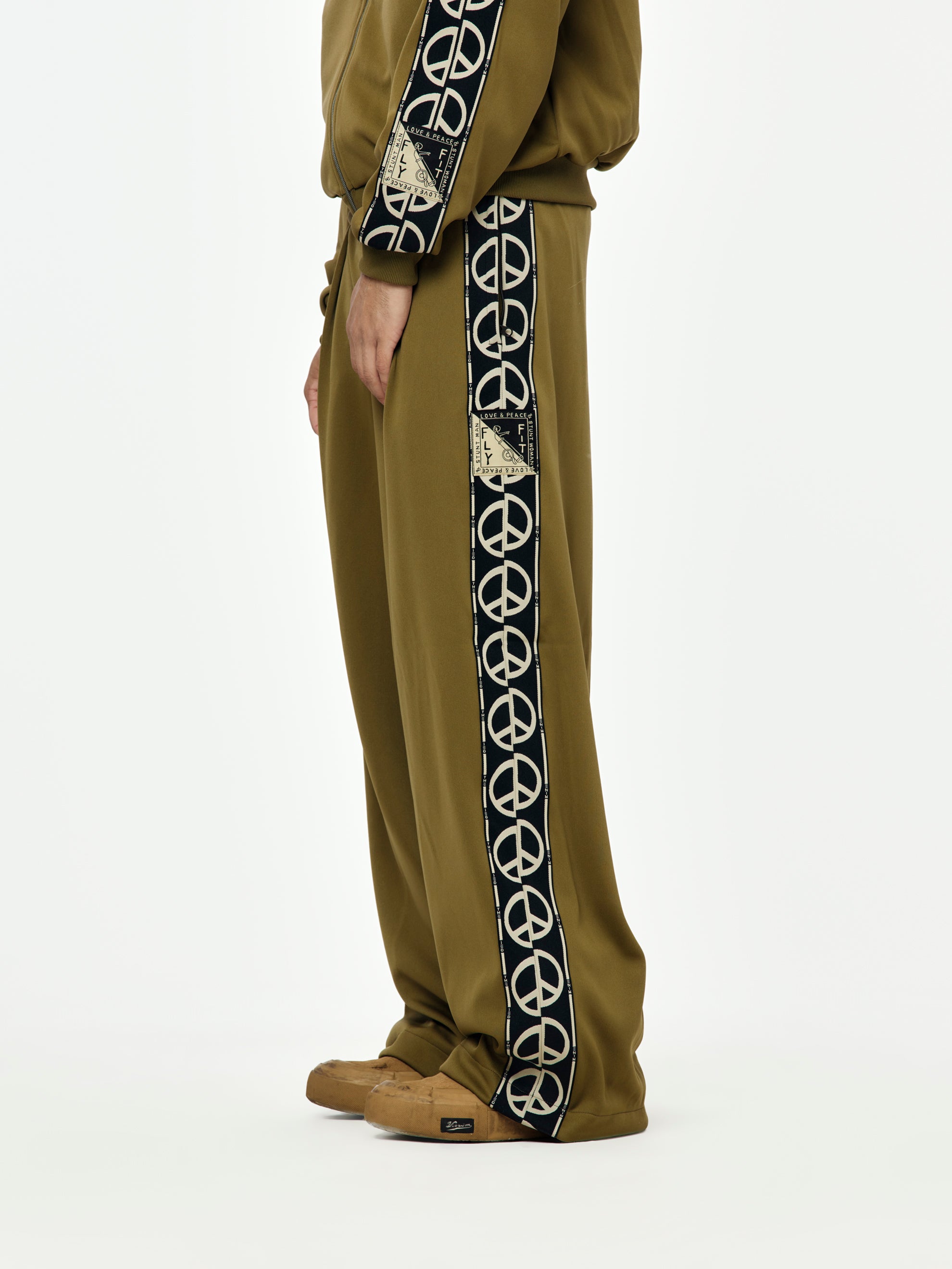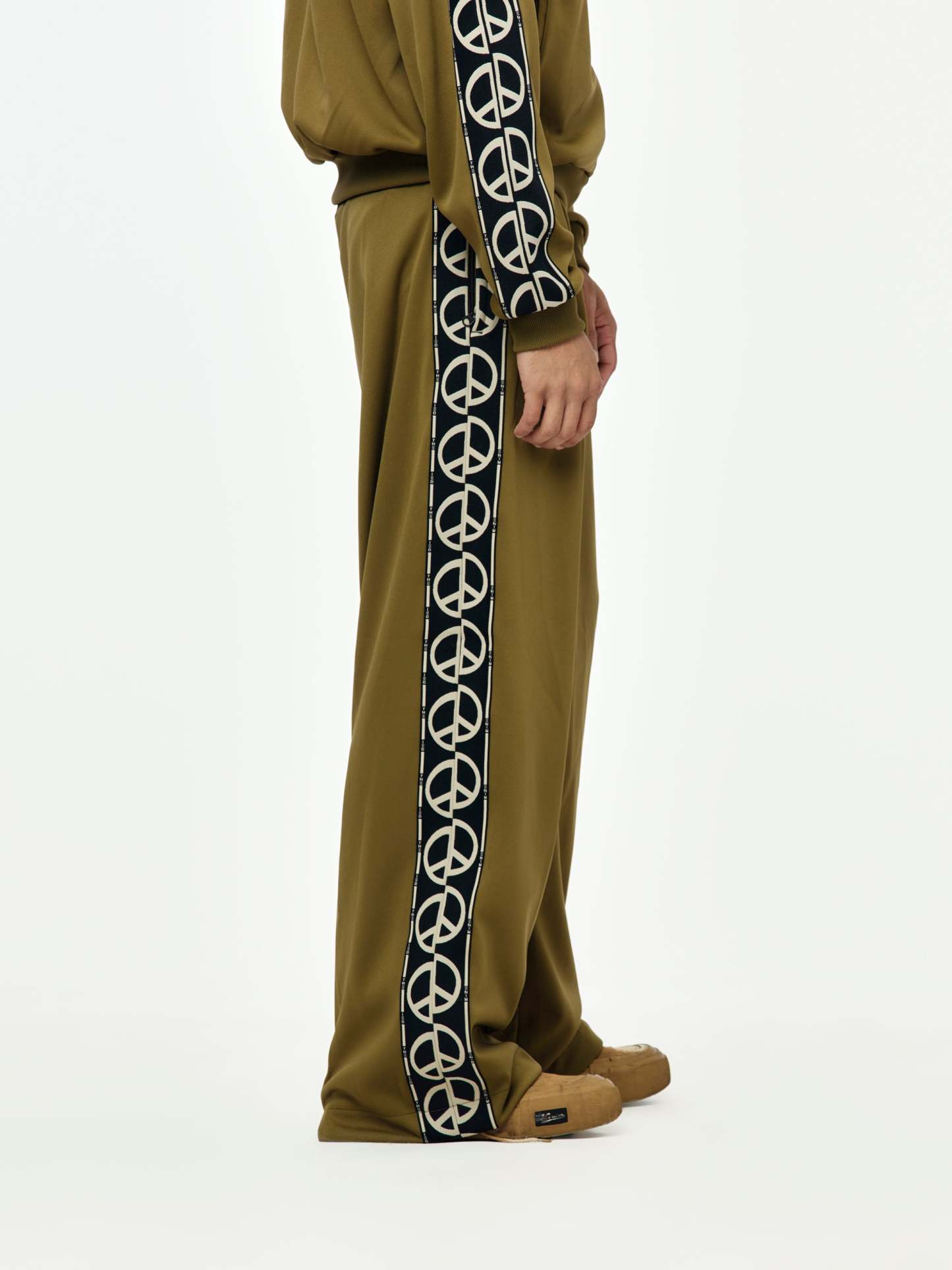 Laid-back meets layered meaning. These KAPITAL baggy track pants flip the familiar with a mirrored “D” motif and peace sign tape running the sides. Cut from a soft, smooth jersey, they land relaxed and easy with an in-tucked, compact waistband for structure. Elastic waist with drawcord for the right fit—loose where it counts. Pairs well with everything and says a little something while doing it.