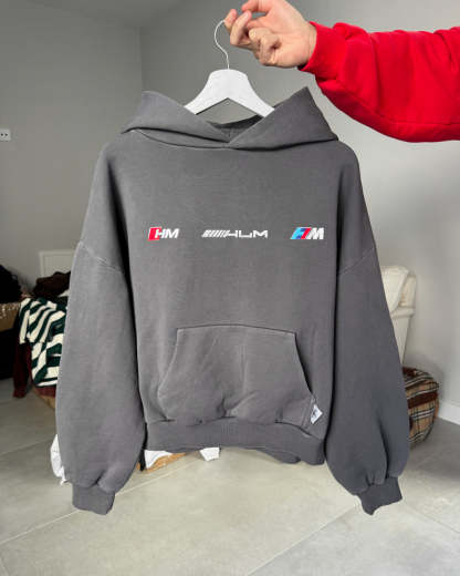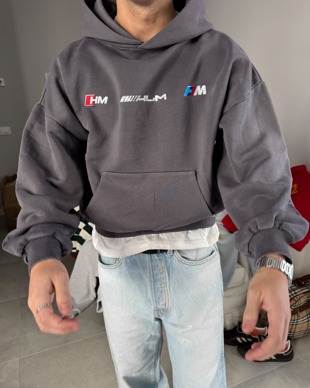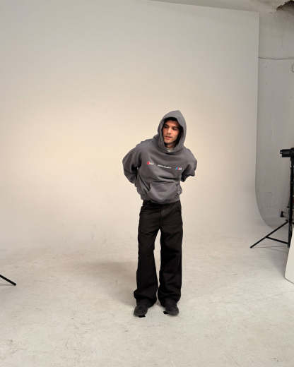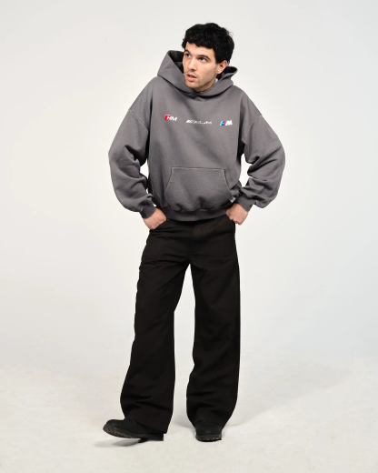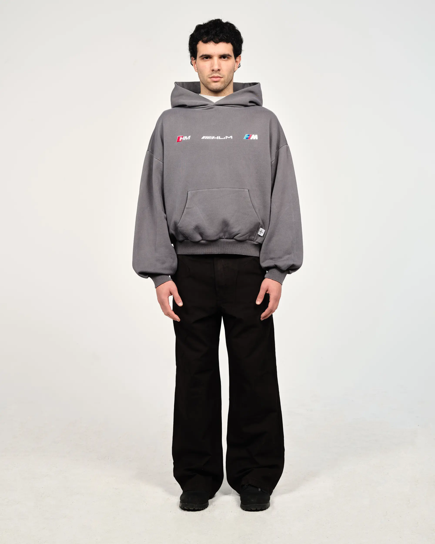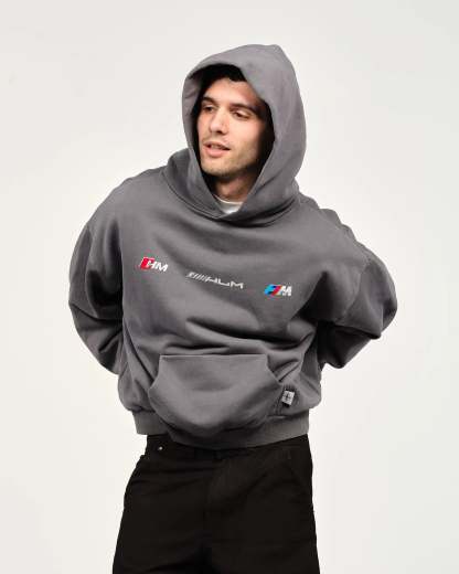 Washed dark grey hoodie 'SPORTLINE' Silver "metallic" patches on the front. Icon flower pocket label.