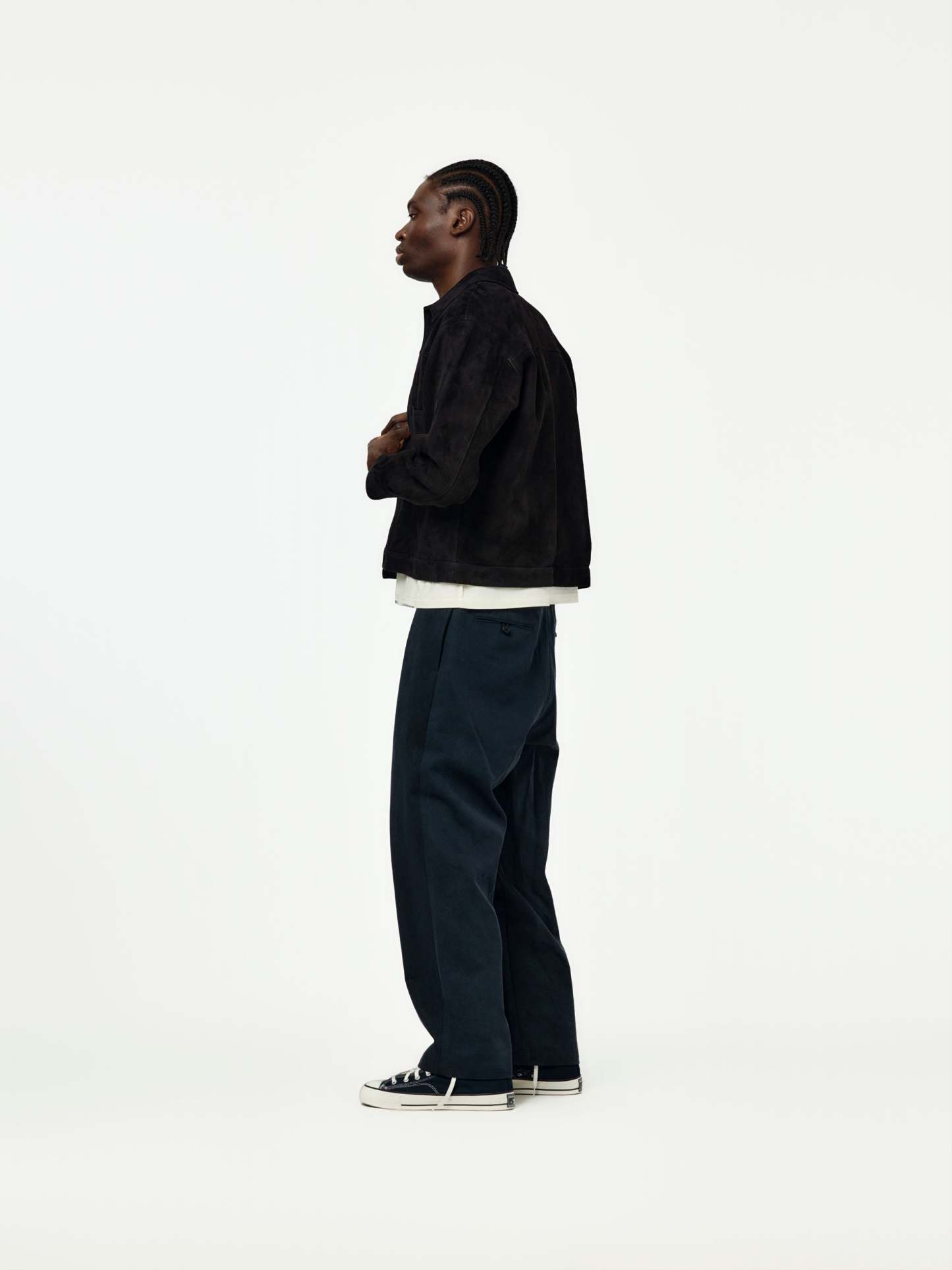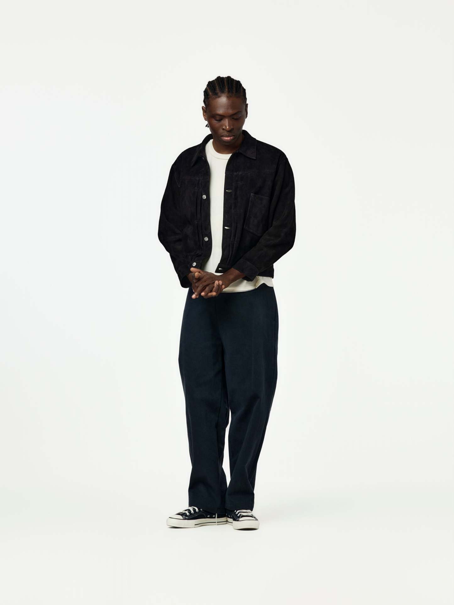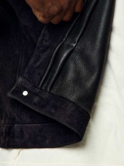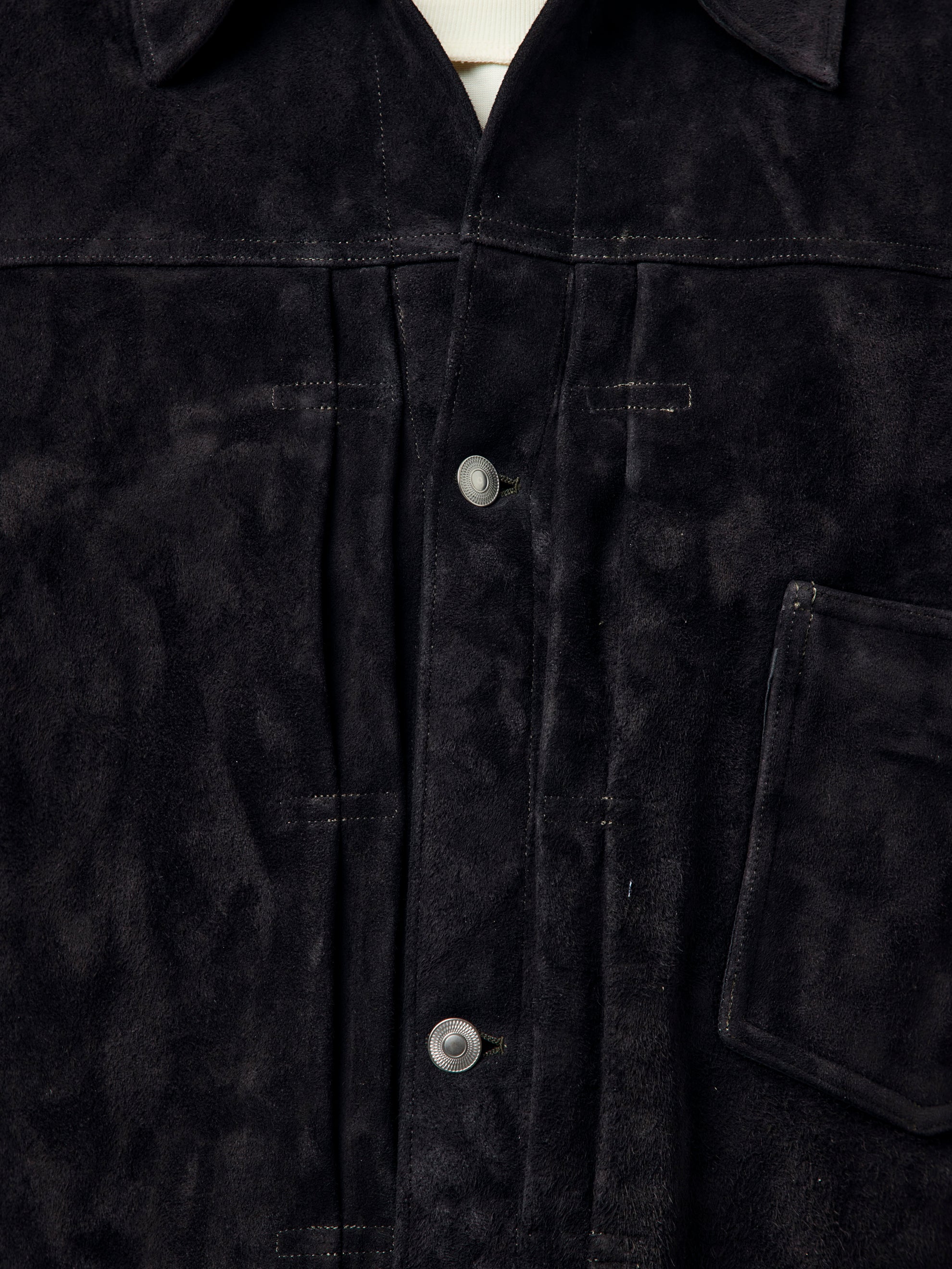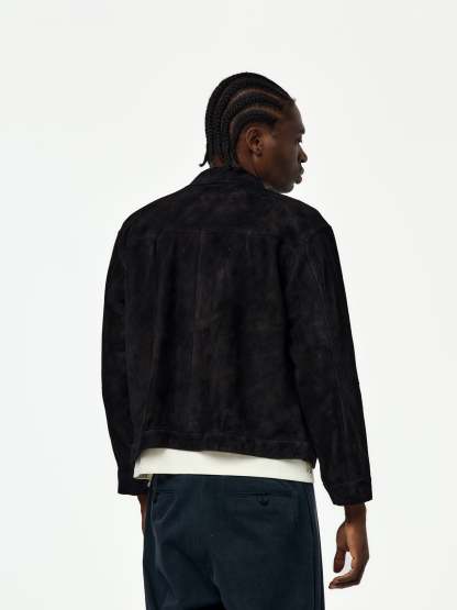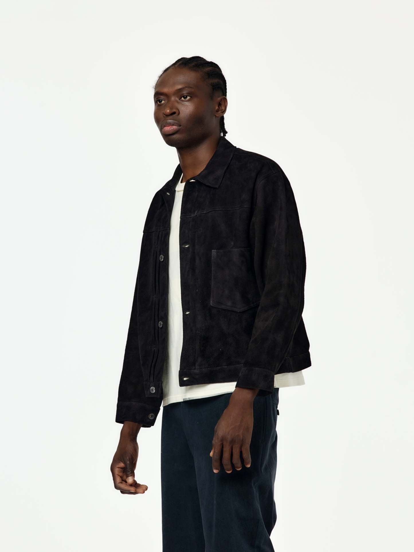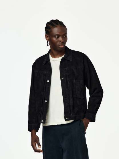 The iconic Levi’s 1st Type trucker reimagined in jet black suede — that’s the A.PRESSE way. Minimalist front pleats, a single chest pocket, and a cropped fit keep it rooted in denim history, while the supple suede shifts it into luxury territory. Wear it hard, let it age, and watch it become your own archive piece.