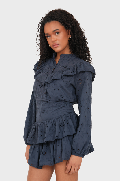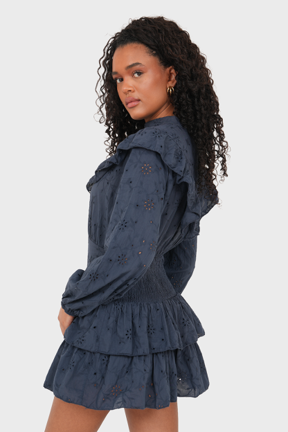 This dress is a true essential for sunny days! The white broderie fabric feels pleasantly airy. The slightly fitted cut beautifully accentuates the waist. Pair the dress with nice boots or ballerinas and you are ready to go!