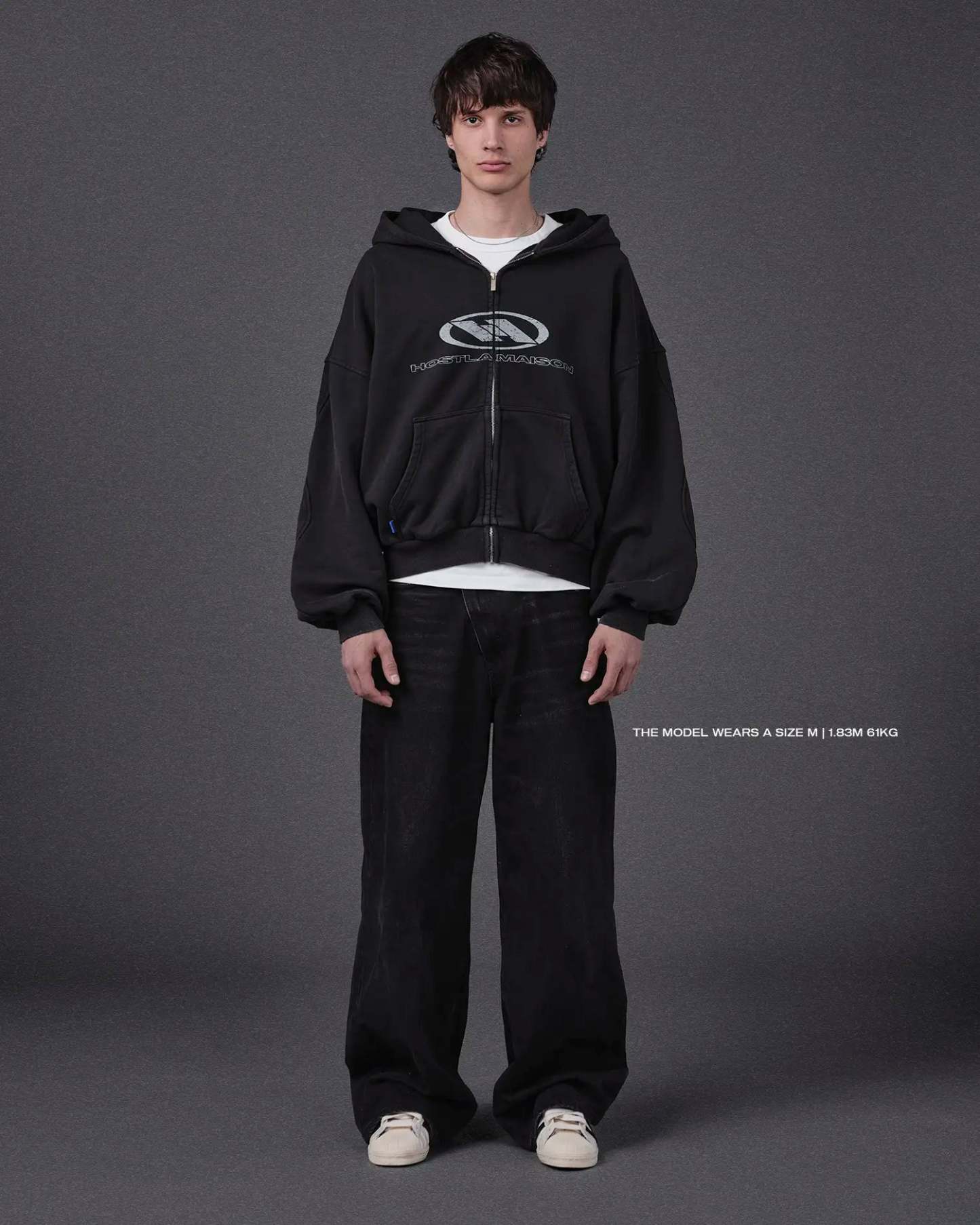 Washed black Host Lamaison zipped hoodie 'HOSTLAMAISON' grey logo printed on the front. Metal custom logo zipper puller. ©Host corporate color pocket label. Wavy shaped sleeves seams.